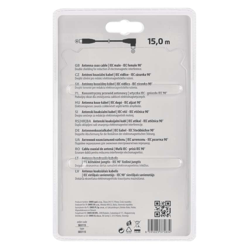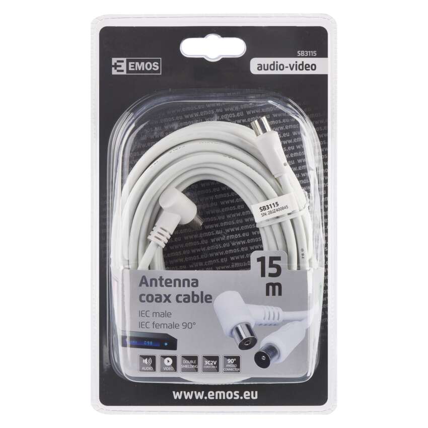 Anténní koaxiální kabel s vidlicí a zásuvkou IEC. Kabel má úhlový konektor (90°). Kabel má dvojité stínění pro redukci elektromagnetického rušení. Délka kabelu je 15 m. Koaxiální kabel je vhodný pro SAT, DVB-T, ANT, DECODER, FLAT TV a TV.