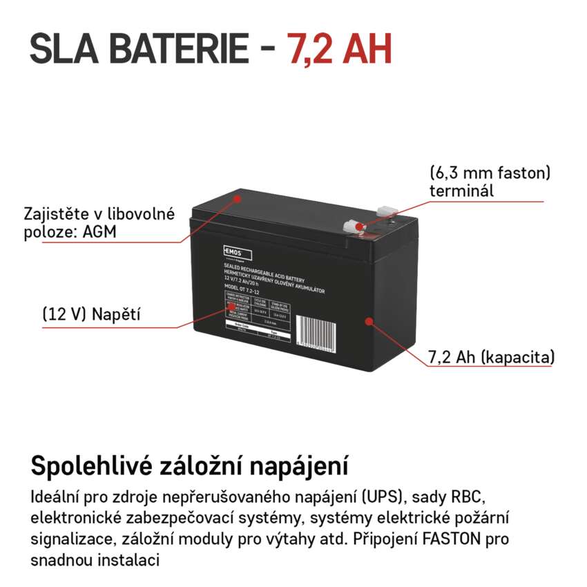 Akumulátor EMOS je vhodný jako náhradní baterie pro záložní zdroje UPS, RBC kity apod. Bezúdržbový, ventilem řízený olověný akumulátor v provedení AGM umožňuje být používán v libovolné poloze. Optimální životnost v záložních systémech je 5 let.Nabíjení baterie musí být prováděno vhodným napájecím zdrojem nebo nabíječem, který má hodnotu nabíjecího napětí 14,4 V pro 12 V akumulátory a 7,2 V pro 6 V akumulátory. V případě, že nabíječ nebo napájecí zdroj nemá tyto parametry, tak dochází k neúplnému nabíjení a dochází k tomu, že akumulátor bude rychle spotřebován a v krajním případě zničen. V tomto případě nelze uznat reklamaci akumulátoru.
