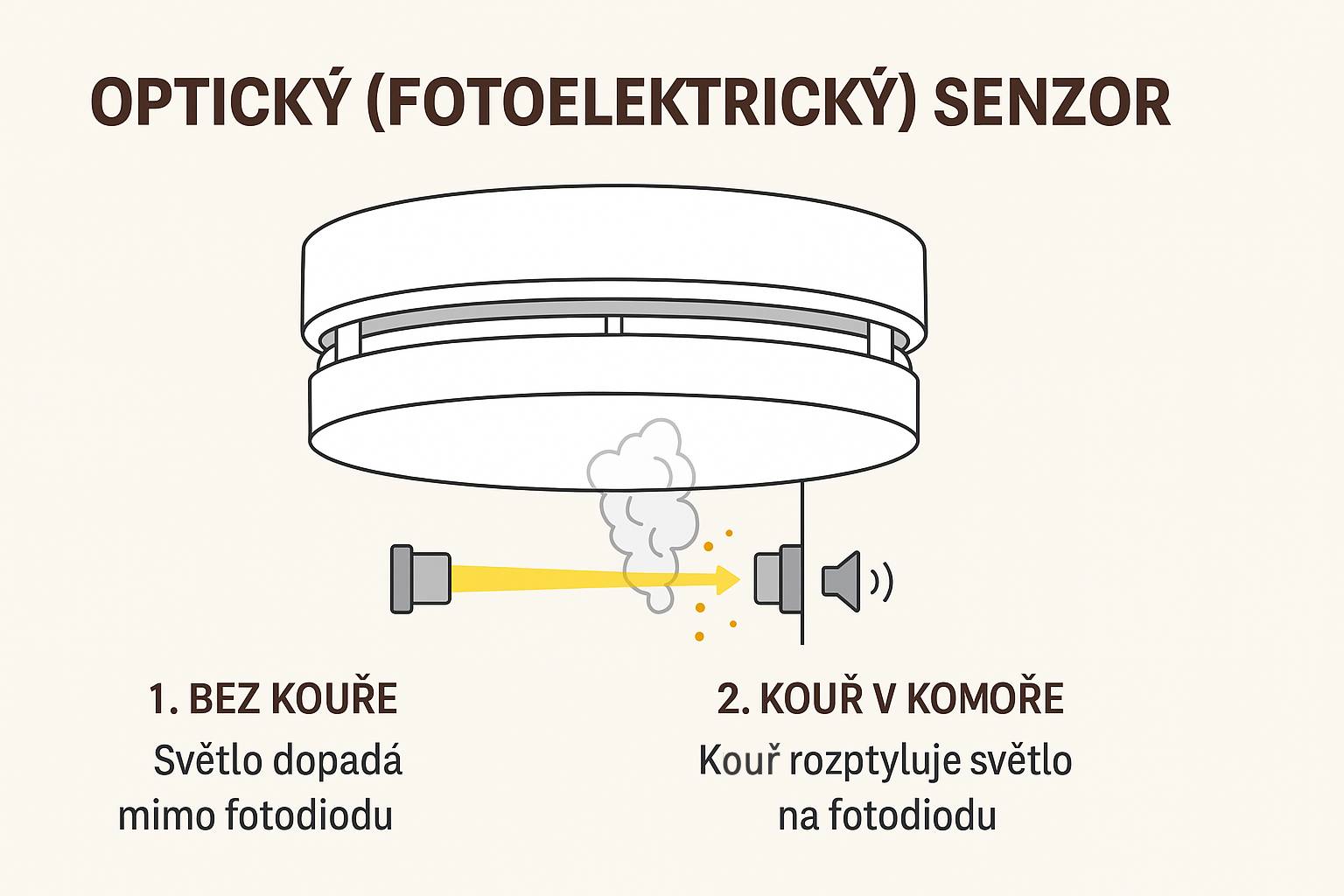 Senzor reaguje na přítomnost viditelných částic kouře ve vzduchu. Nezaznamenává však plyn, teplotu ani plamen. Proto je dobré ho doplnit o detektor oxidu uhelnatého, pokud máte v domácnosti spotřebiče na plyn nebo pevná paliva. Nejlépe zachytí doutnající požáry např. hořící kabely či přetížené zásuvky. Jejich výhodou je, že jsou méně náchylné k falešným poplachům (např. z páry), pokud jsou správně umístěny.