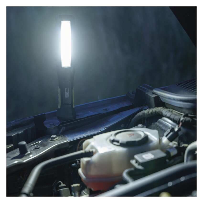 Široký pás světla (COB LED), kterým si dobře posvítíte do blízkého okolí, naříklad při práci na opravě automobilu.