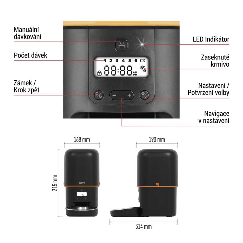 Nastavte si jednotlivá krmení na počet porcí přesně dle potřeb vašeho domácího miláčka. Velikost jedné porce je 5 gramů. Krmítko obsahuje také indikátor stavu krmiva v dávkovači. V případě nízkého stavu bude na displeji blikat dioda, která vás upozorní na potřebu dosypání granulí.