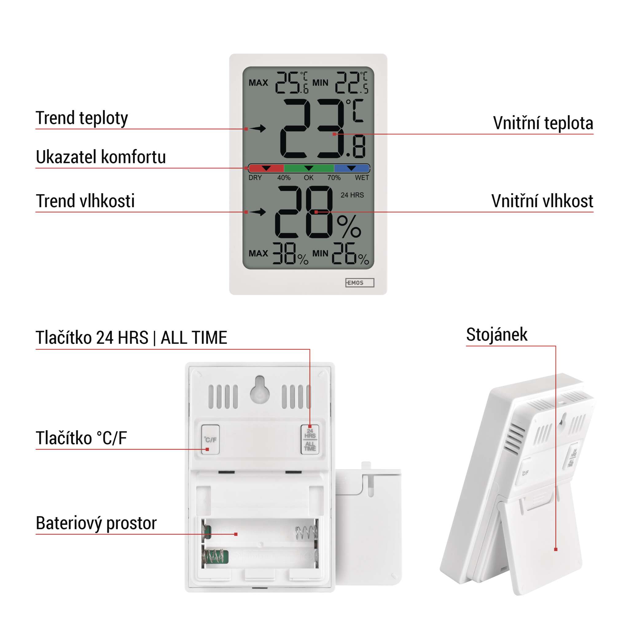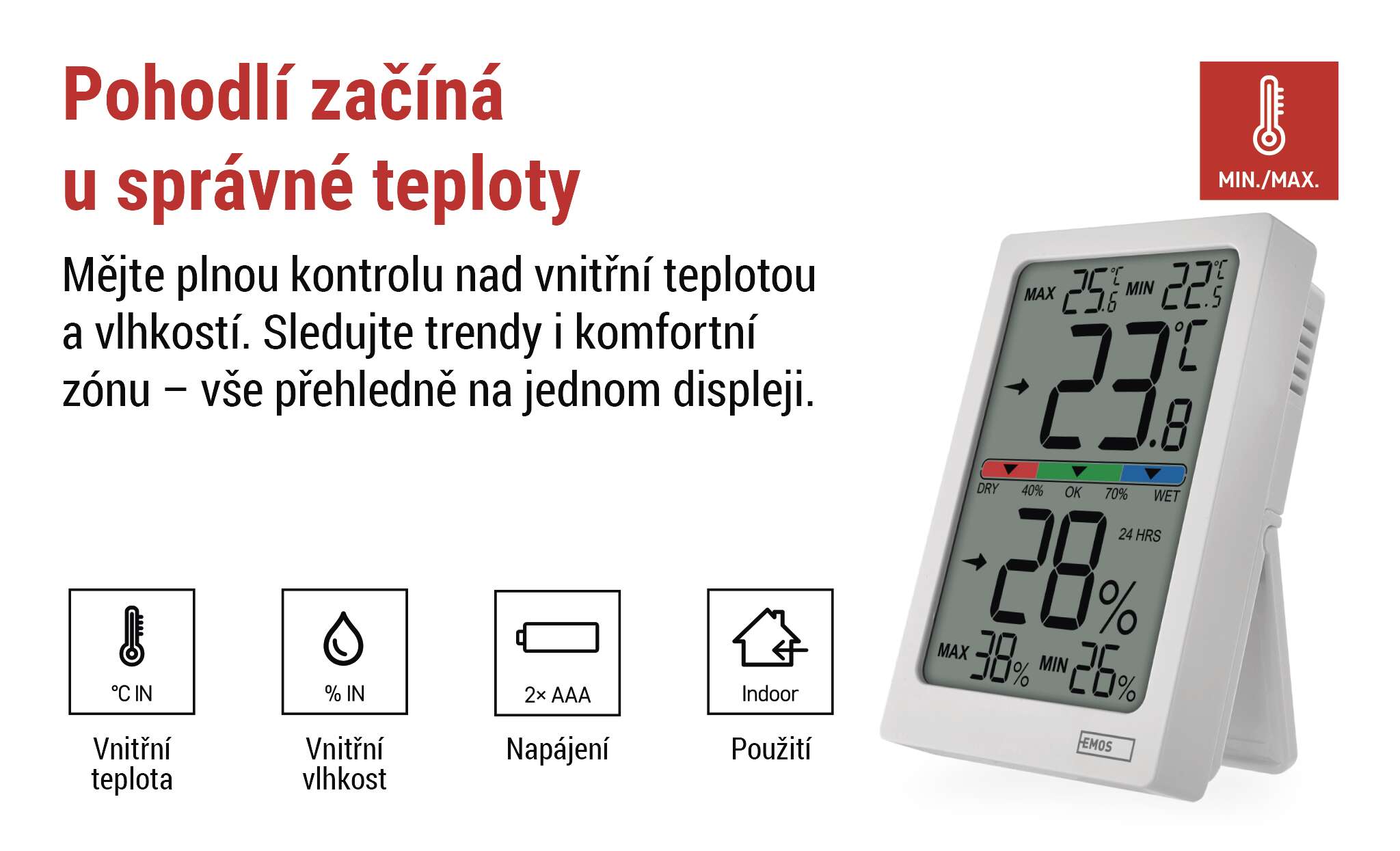 Nabízí komplexní řešení pro měření vnitřní teploty v rozmezí -10 °C až +50 °C s rozlišením 0,1 °C a vlhkosti od 1 % až po 99 % RV. Díky tříúrovňovému ukazateli komfortu (na základě vlhkosti), zobrazení maximálních a minimálních hodnot a přehledu trendů teploty i vlhkosti máte vše důležité neustále pod kontrolou. Snadno můžete přepínat mezi jednotkami °C/°F. Přehledný displej s velkými číslicemi zajistí skvělou čitelnost.