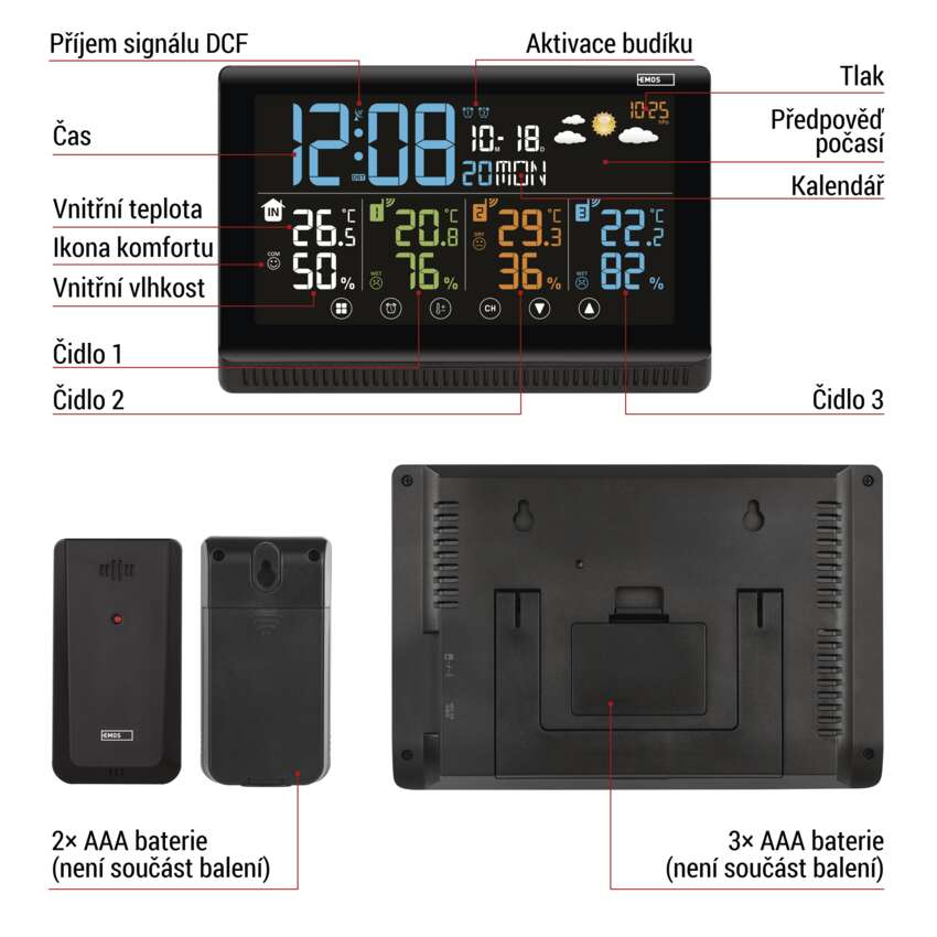 Výstupní čidla, která jsou napájena 2× AAA bateriemi, můžete dle potřeby umístit jak doma tak venku. Součástí balení jsou 3 výstupní čidla. Meteostanice měří vnitřní teplotu v rozmezí -10 °C až + 50 °C a venkovní teplotu v rozmezí -40 °C až +70 °C s rozlišením 0,1 °C.