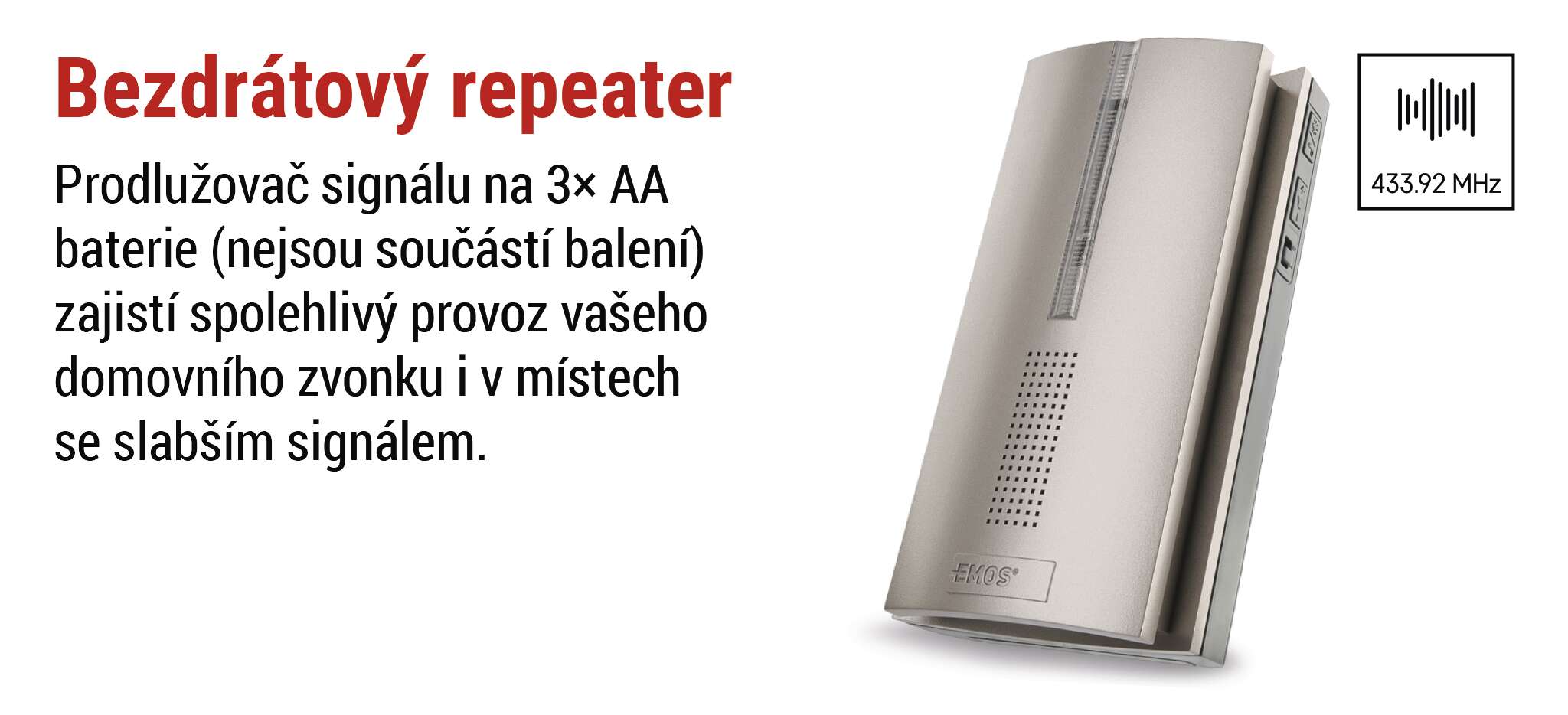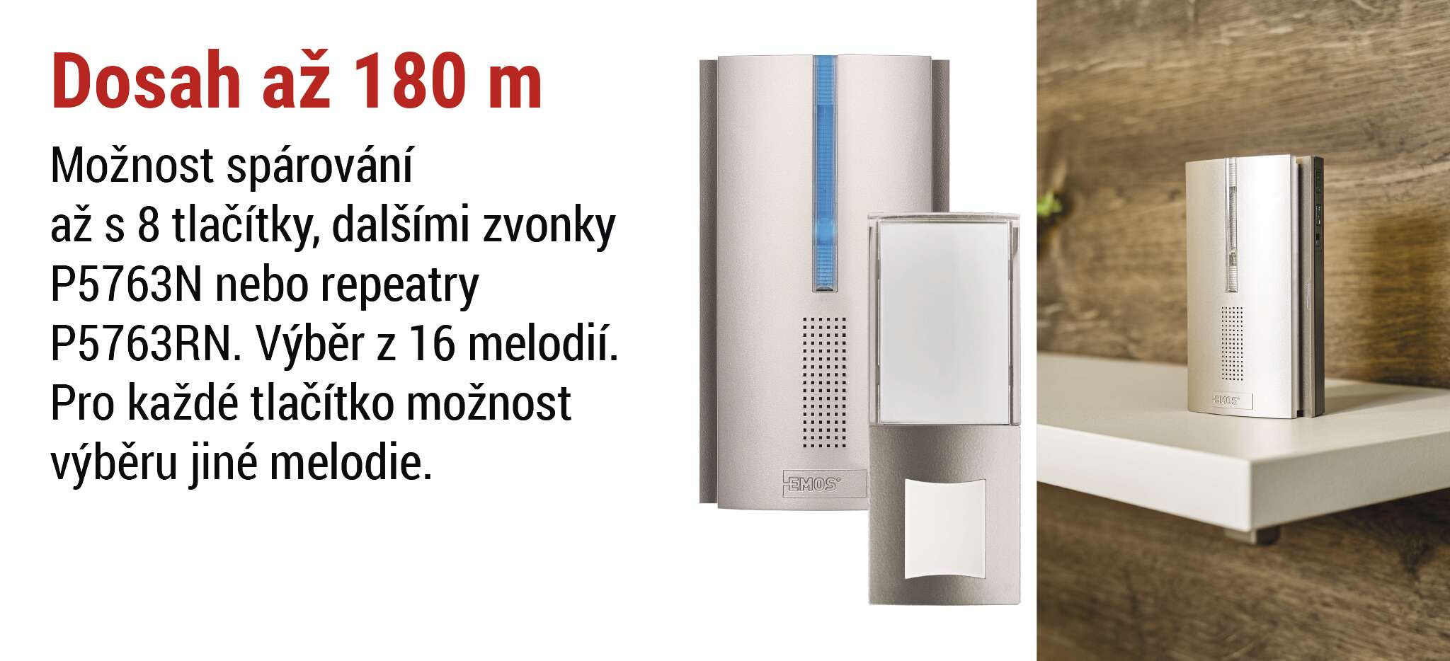 EMOS P5763RN přijímá signál od tlačítka zvonku (např. P5760T) a zároveň ho opakuje dál. Slouží tak jako repeater, čímž efektivně prodlouží pokrytí celého zvonkového systému. Lze ho kombinovat se zvonky EMOS řady P5760N a P5763N a přidat až 8 různých tlačítek.