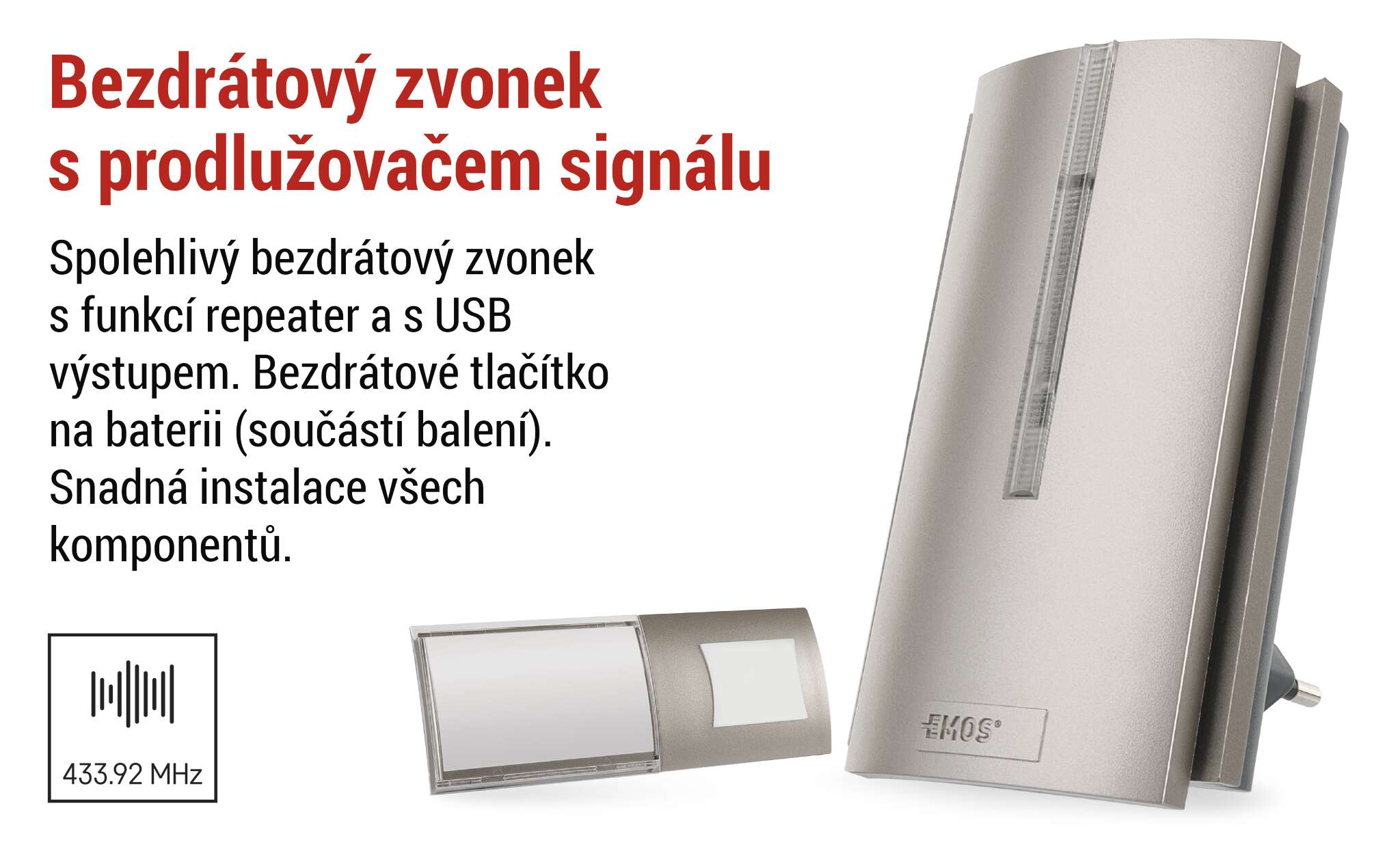 Spolehlivý zvonek s funkcí repeater a USB výstupem, který se hodí nejen k domu, ale i bytu, nebo do kanceláře. Velkou předností tohoto zvonku je jeho bezdrátové provedení.