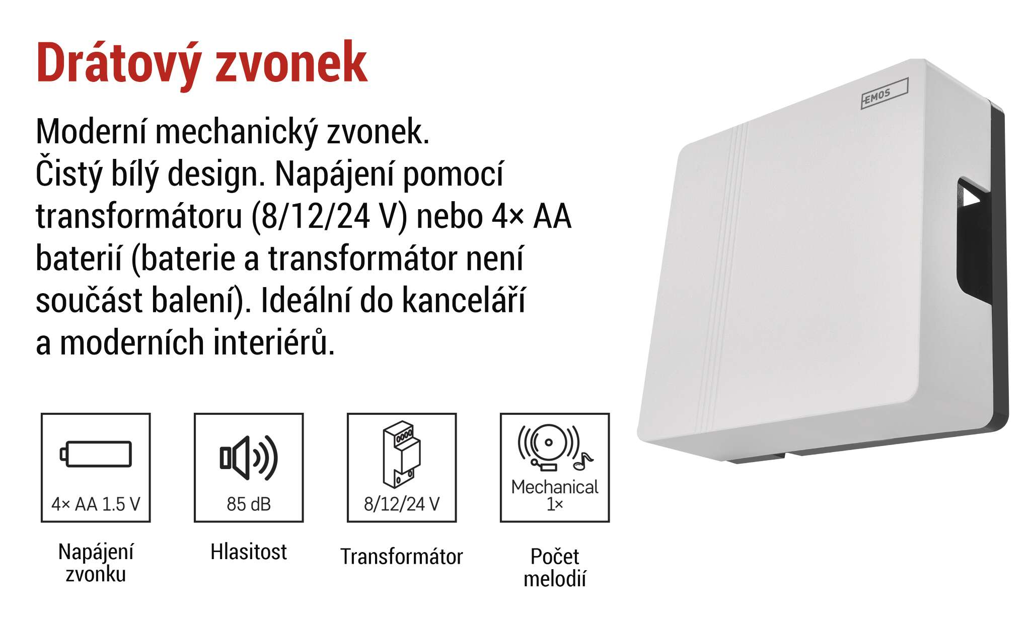 Zvonění s hlasitostí 85 dB zaručí, že návštěvu určitě nepřeslechnete. Díky jednoduchému zapojení a absenci složitého nastavování je tento model skvělou volbou pro každého.