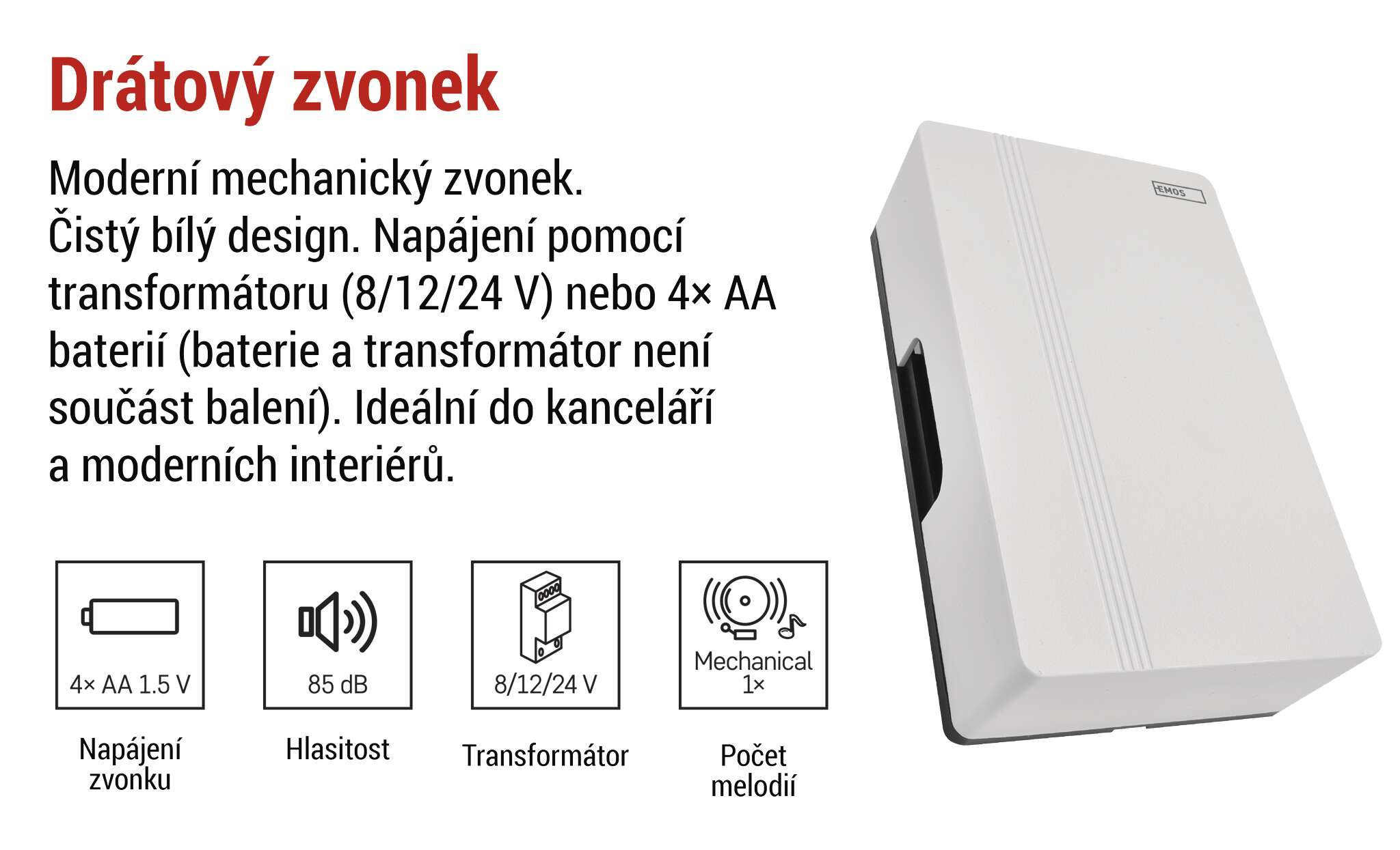 Zvonění s hlasitostí 85 dB zaručí, že návštěvu určitě nepřeslechnete. Díky jednoduchému zapojení a absenci složitého nastavování je tento model skvělou volbou pro každého.