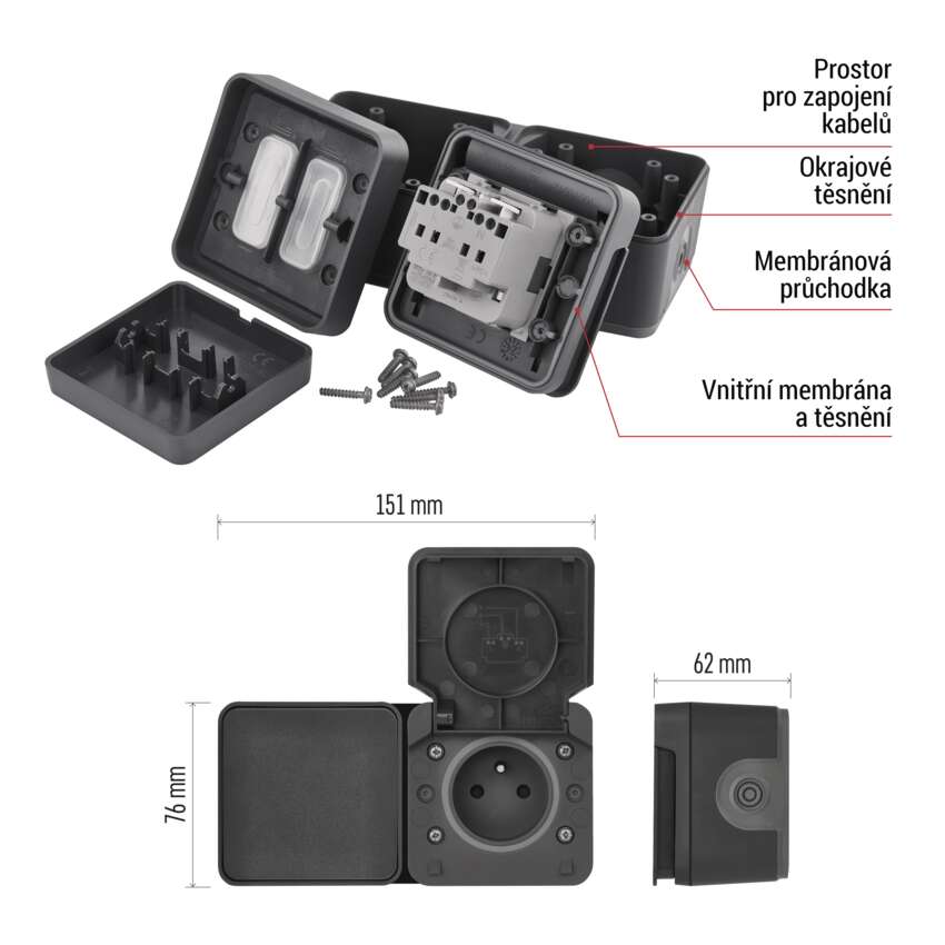 | provedení | 2 nás. voděodolné - 1× zásuvka + 1× přepínač střídavý |