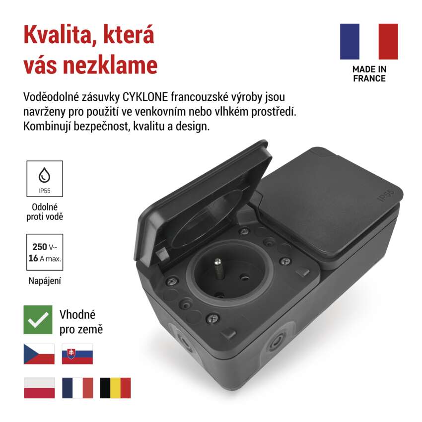 Objevte naše vysoce kvalitní venkovní nástěnné zásuvky řady CYKLONE – ideální řešení pro bezpečné a pohodlné napájení na terasách, zahradách či balkónech. S odolností vůči povětrnostním vlivům a moderním designem, naše zásuvky vám umožní snadný přístup k elektrické energii venku, ať už potřebujete napájet světla, elektrické nářadí nebo dekorace.