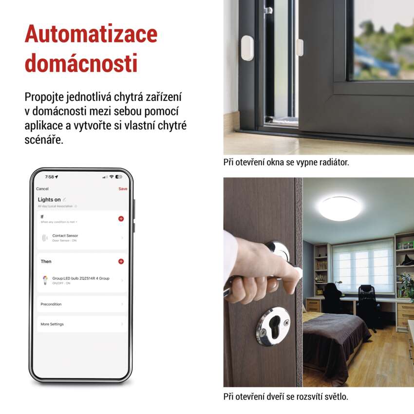 Hlavní výhodou použití GoSmart dveřních senzorů je jejich využití v domácí automatizaci. Automatické rozsvícení světel při vstupu do místnosti, vypnutí topení při otevření okna, upozornění na otevření dveří v době, kdy je otevřené mít nechcete, a mnoho dalších scénářů nebude s naším senzorem žádný problém.