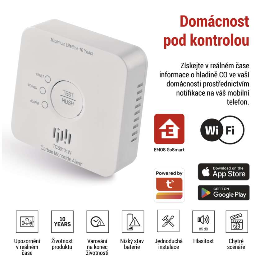 Oxid uhelnatý je plyn bez zápachu a představuje riziko otravy jak pro lidi, tak i zvířata. Chytrý CO detektor je moderní zařízení, které v reálném čase monitoruje hladinu oxidu uhelnatého (CO) a poskytuje včasné upozornění na nebezpečí. Upozorní vás zvukovým signálem o hlasitosti 85 dB, světelnou diodou a notifikací v aplikaci EMOS GoSmart ve vašem mobilním zařízení. Detektor lze pověsit nebo postavit kdekoliv v místnosti, kde je riziko úniku CO, například u plynového kotle nebo kamen. Doporučujeme ho také do ložnic nebo obývacích a dětských pokojů.
