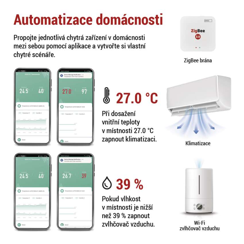 Teploměr snadno zapojíte do automatizací vaší domácnosti pomocí mobilní aplikace EMOS GoSmart nebo pomocí platformy TUYA. Vytvořte si chytré scénáře a propojte jej např. s chytrou termostatickou hlavicí, odvlhčovačem nebo ventilátorem v chytré zásuvce.