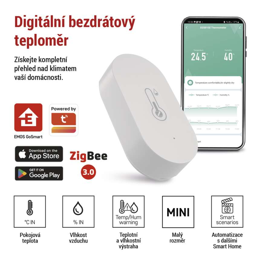 Chytrý digitální bezdrátový teploměr propojte se ZigBee bránou a spárujte s mobilní aplikací EMOS GoSmart, která je dostupná pro Android i iOS. Díky tomu, že je napájen pomocí baterie, která je součástí balení, jej můžete umístit kdekoliv ve vašem interiéru.