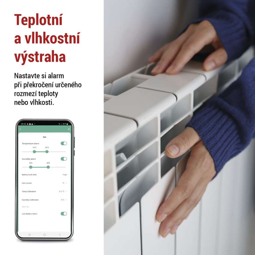 Při překročení zadaného rozmezí teploty nebo vlhkosti vám přijde upozornění na váš mobilní telefon.