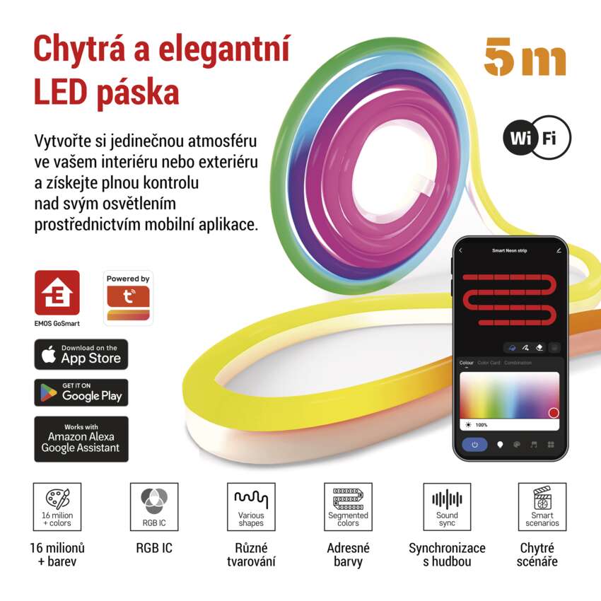 Objevte kouzlo osvětlení s naším Smart ohebným LED páskem NEON! Tento 5metrový RGBIC pásek s více jak 16 miliony barvami nabízí segmentové ovládání barev a je plně ovladatelný pomocí bezplatné aplikace EMOS GoSmart, která je dostupná pro Android i iOS. Nastavte si barvy, jas a osvětlení podle svých představ, nechte pásek reagovat na hudbu, využijte přednastavené nebo vaše vlastní světelné režimy, vytvářejte scény a automatizace. Funkcemi nabitý LED pásek NEON vytvoří atmosféru, která dokonale ladí s vaším stylem!