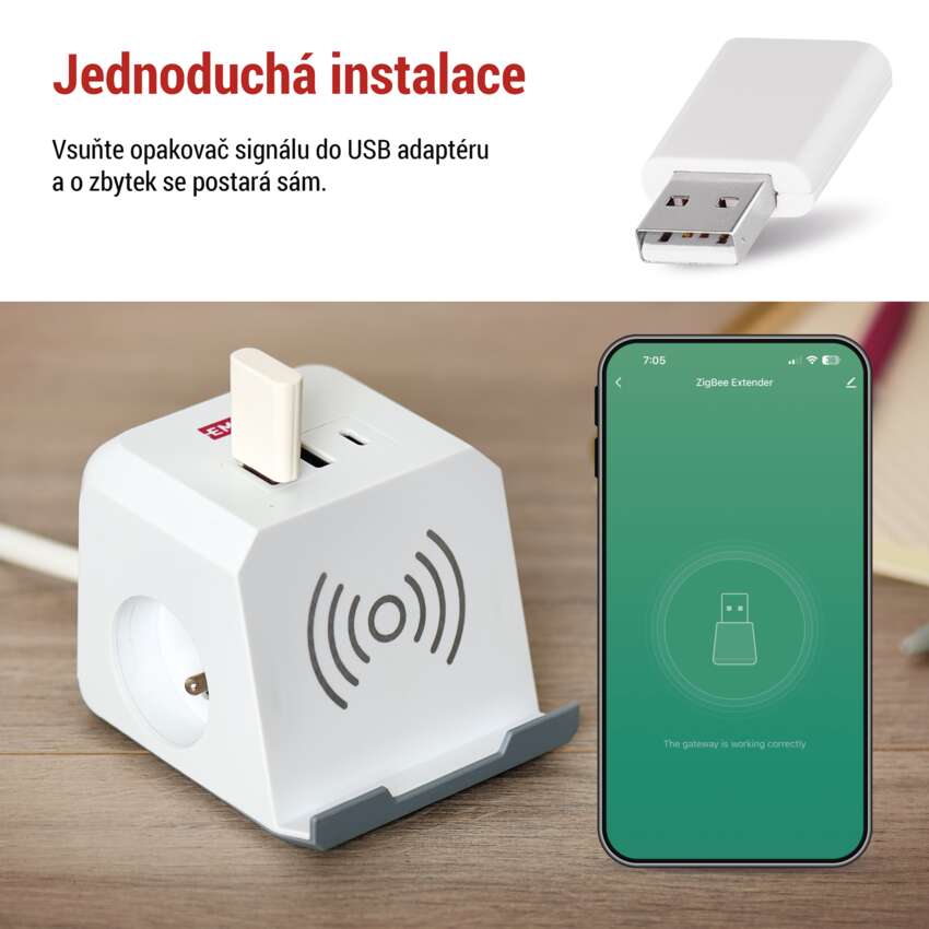 Instalace ZigBee opakovače signálu je velmi snadná a zvládne ji každý. Stačí pouze vsunout do USB adaptéru nebo zásuvky s USB portem. Žádné složité konfigurace nebo technické kroky nejsou potřeba. Po vsunutí do USB portu se opakovač automaticky spáruje s vaší ZigBee sítí a začne rozšiřovat dosah signálu.