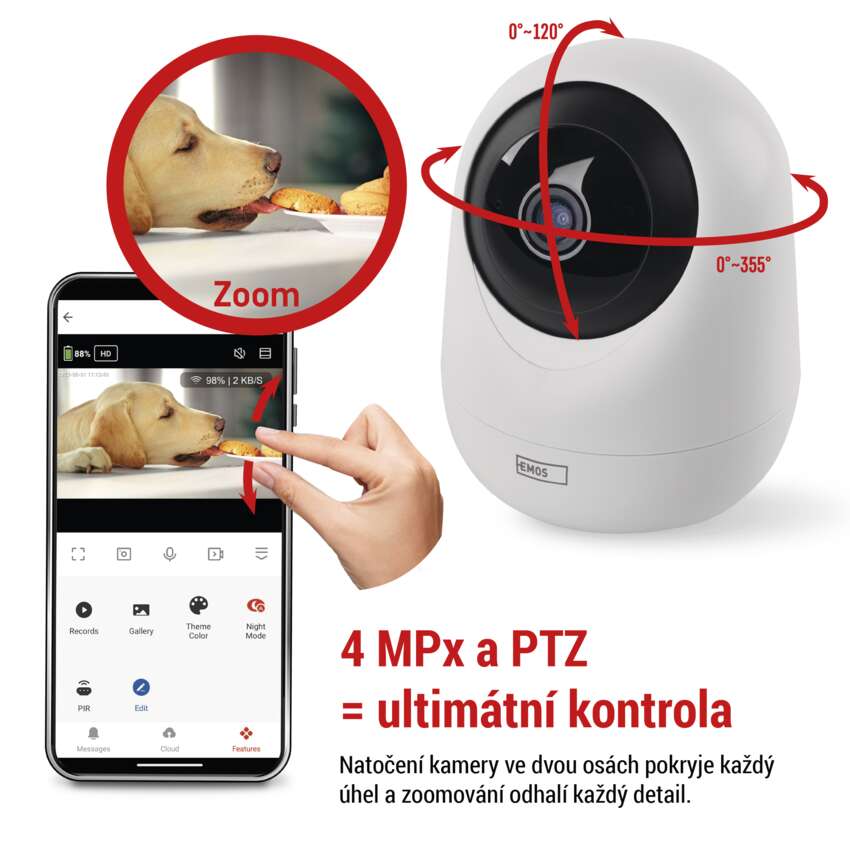 - funkce PTZ (natočení kamery ve dvou osách a zoomování) - natáčejte a přibližujte kameru dle potřeby pro komplexní pokrytí sledované oblast