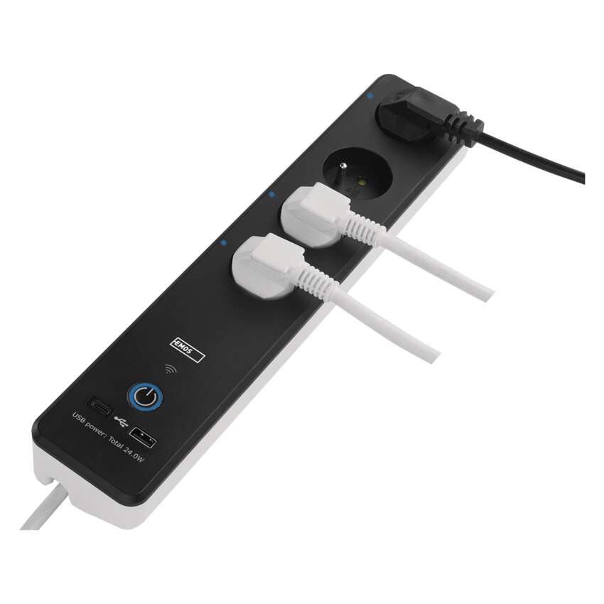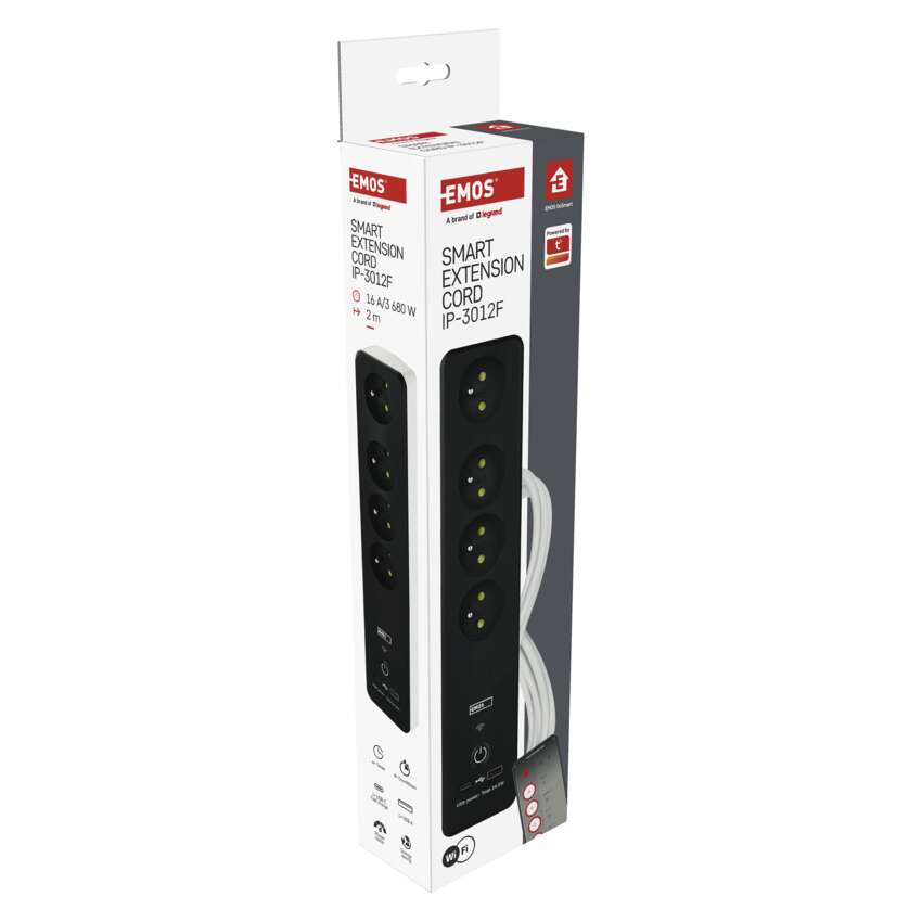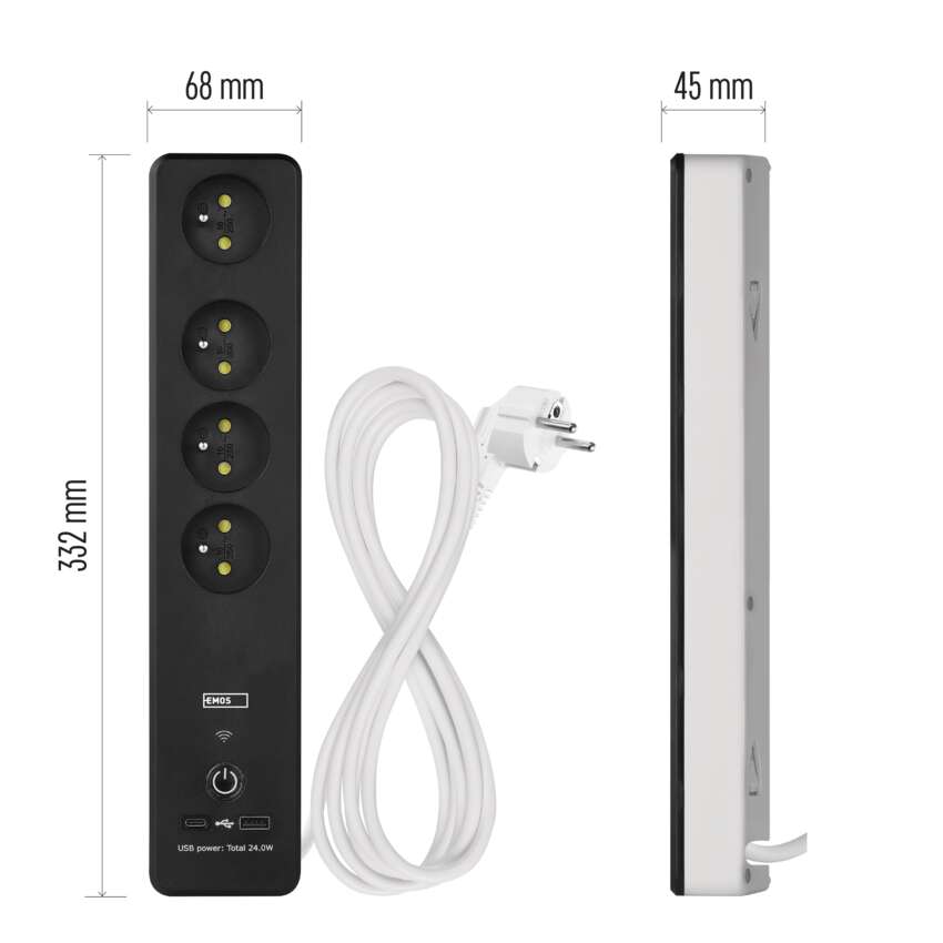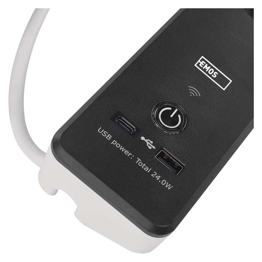 SMART prodlužovací přívod - Wi-Fi. 4 zásuvky + 2 USB výstupy. Přenosová frekvence: 2,4 GHz. Wi-Fi standard IEEE 802.11 b/g/n. Bezpečnostní mechanismy: OPEN/WEP/WPA-PSK/WPA2-PSK. USB výstup typ A + typ C: 5 V DC Max. 4,8 A, Max. 24 W. Platforma TUYA - EMOS GoSMART.Možnost ovládání každé zásuvky přes aplikaci EMOS GoSMART. Funkce měřič spotřeby pro zásuvky 230 V. Funkce časovače pro každou zásuvku 230 V. Možnost manuálního vypnutí a zapnutí všech zásuvek.