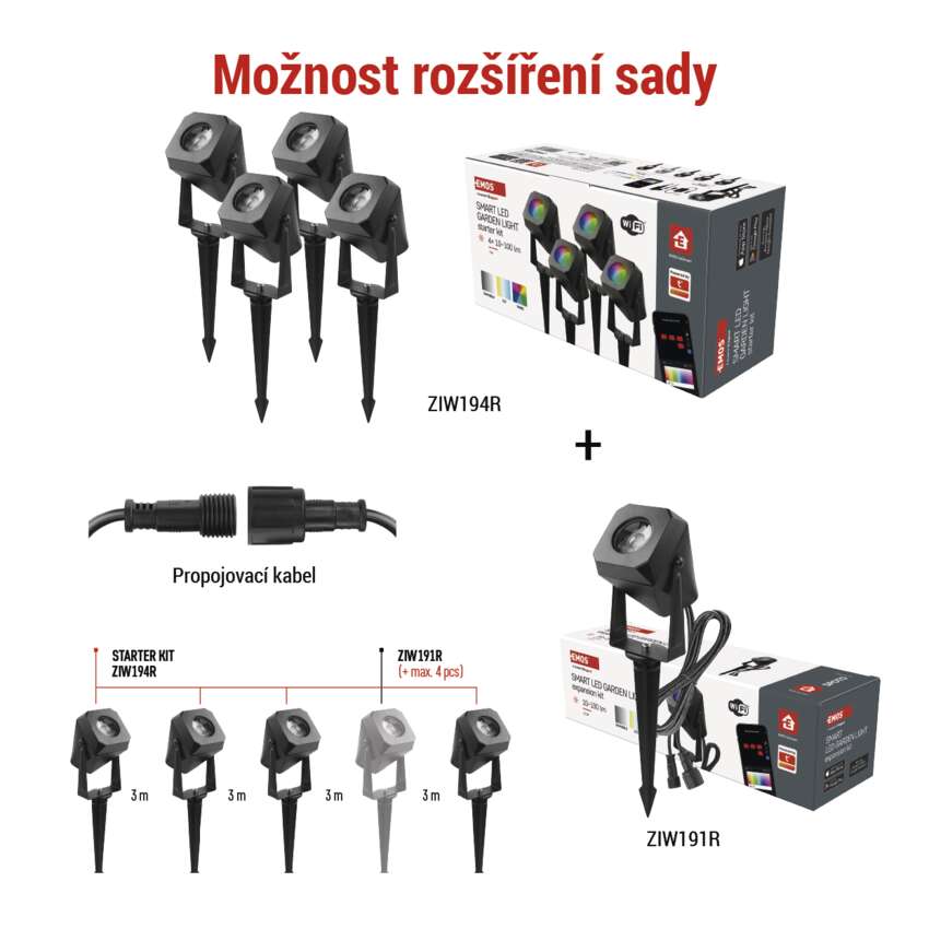 Tato rozšiřující sada obsahuje 1 ks bodového světla a je určena k rozšíření startovací sady ZIW194R. Díky ní můžete navýšit celkový počet bodových světel až na 8 - při využití až 4 rozšiřujících sad společně s jednou startovací. Systém tak nabízí široké možnosti přizpůsobení a rozvržení světel podle vašich představ, např. na osvětlení příjezdové cesty, prvků ve vaší zahradě nebo fasády domu. Rozestup mezi jednotlivými světly je až 3 m.