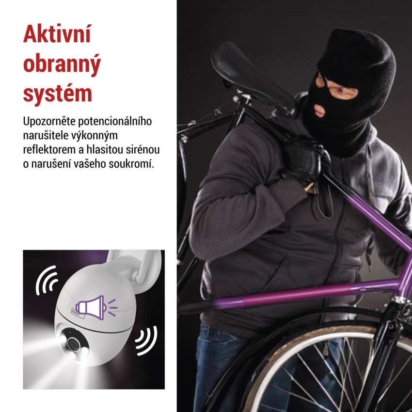 Kvalitní LED reflektor zajistí osvětlení monitorované oblasti a barevný záznam i v úplné tmě, navíc společně s integrovanou sirénou vytvoří aktivní obranný systém.