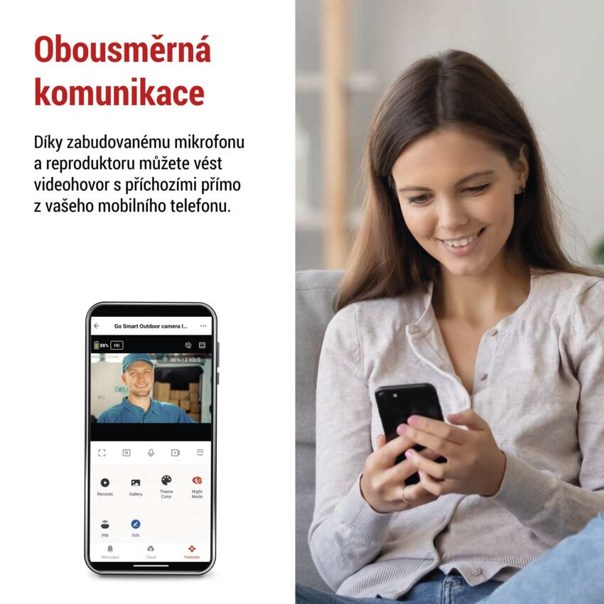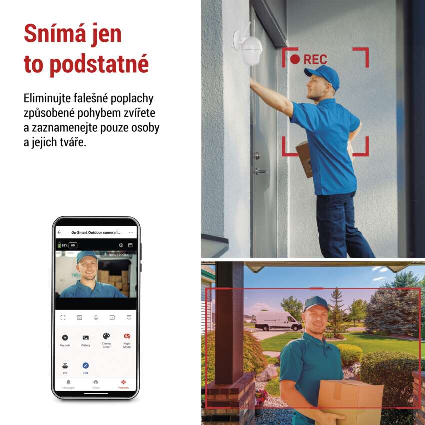 Inteligentní funkce kamery dokáže eliminovat falešné poplachy způsobené pohybem zvířat či dopravních prostředků. Jsou tak zaznamenávány pouze osoby a jejich tváře. Na základě detekce pohybu a zvuku obdržíte notifikaci na váš mobilní telefon a současně začne kamera pořizovat obrazový záznam, který automaticky ukládá na cloudové úložiště nebo mikro SD kartu o kapacitě až 128 GB.