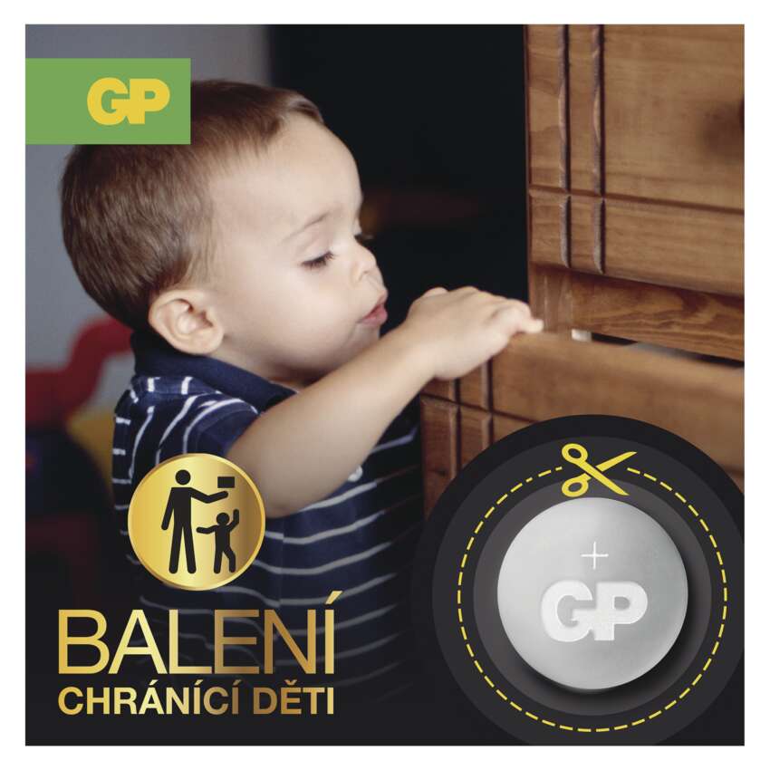 Díky speciálně navrženému obalu nebudou mít malé dětské ručičky šanci baterii GP z obalu bez dopomoci rodičů vyjmout. Obal je konstruován tak, aby k jeho otevření bylo nutné využití nůžek.