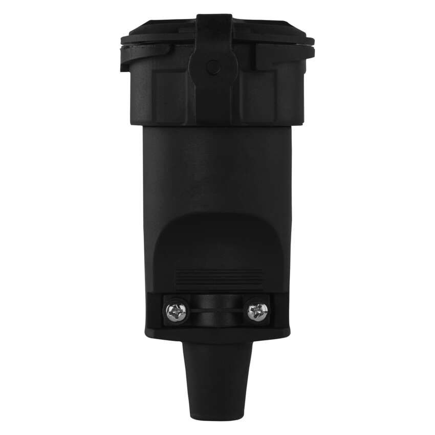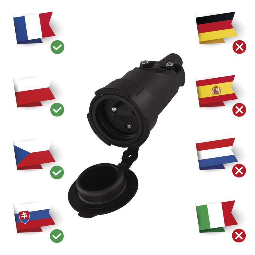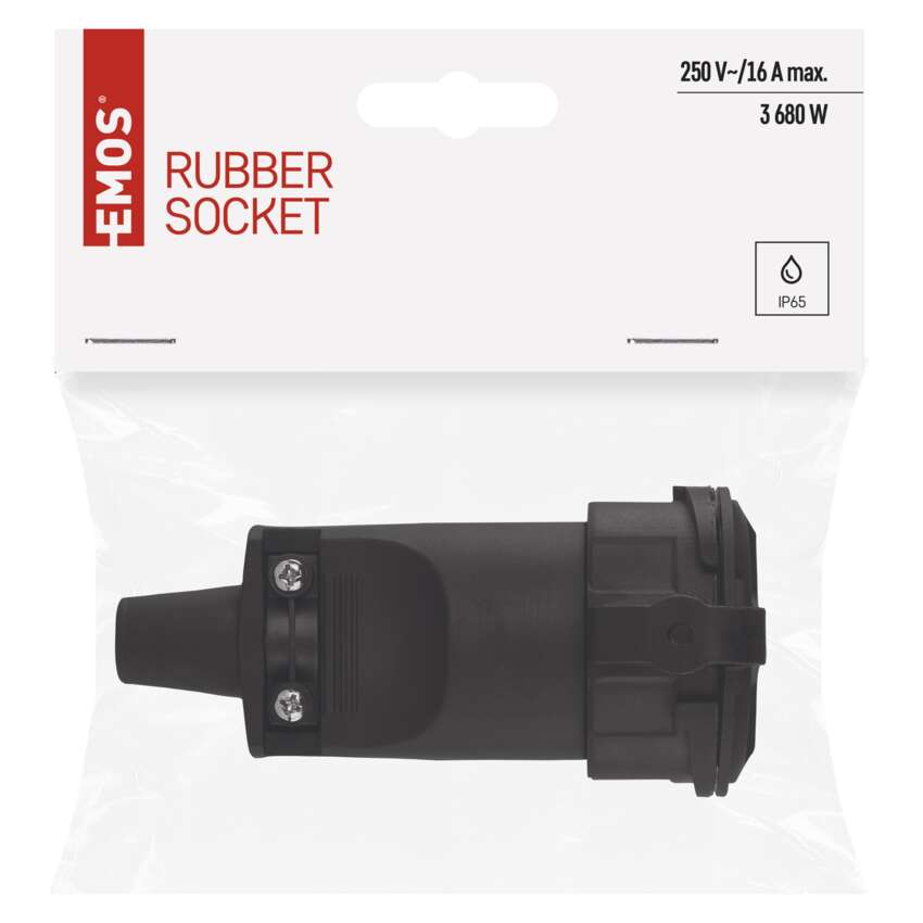 Gumová zásuvka pro pohyblivý prodlužovací přívod. Je určena k připojení elektrických zařízení kde je vyžadován vyšší stupeň krytí (i v exteriéru).