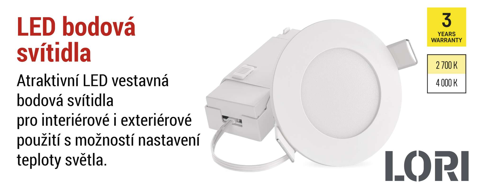 LORI je moderní vestavné bodové svítidlo, které se vyznačuje nízkým příkonem 4,5 W a světelným tokem 345 lumenů. Díky širokému úhlu vyzařování 110° dokonale osvětlí vybrané místo s příjemnou barevnou teplotou 2 700 nebo 4 000 K. Díky robustní konstrukci a záruce 3 roky je ideální volbou pro náročné interiéry, kde je kladen důraz na spolehlivost, design a energetickou úspornost. Představuje ideální volbu do koupelen a dalších míst, kde je třeba krytí IP65.