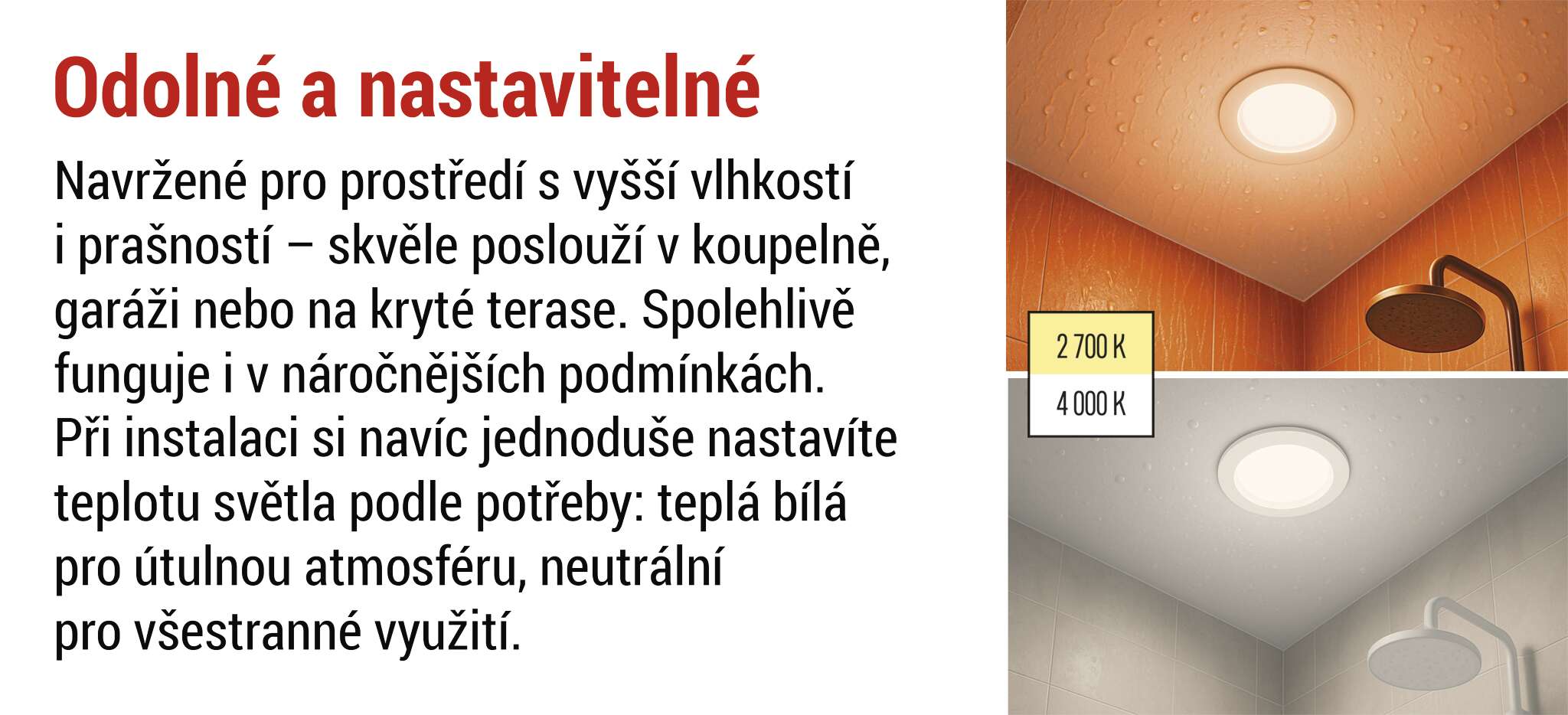 LORI představuje ideální volbu pro všechny, kdo hledají spolehlivé, energeticky úsporné a designově čisté řešení osvětlení do vlhkých prostor. Díky vysokému krytí odolá prachu i stříkající vodě, což z něj činí perfektní svítidlo do koupelen, kuchyní nebo komerčních prostor. Svítidlo přináší příjemné a kvalitní světlo s věrným podáním barev. LORI je dostupné v klasické bílé i elegantní černé variantě, takže snadno zapadne do jakéhokoli interiéru a doplní jeho styl. Navíc s tříletou zárukou získáte jistotu dlouhodobé kvality a spolehlivosti.