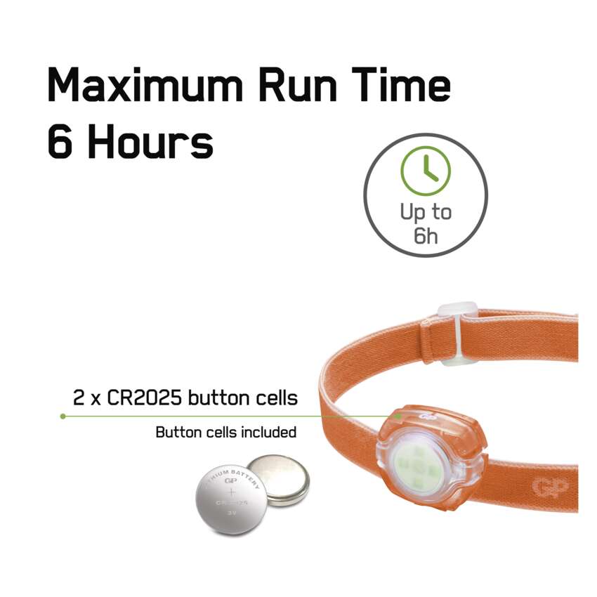K abnormálně nízké hmotnosti čelovky GP Everybody přispívá také fakt, že energii čerpá ze 2 lithiových knoflíkových baterií (CR2025). Ty přes svou minimalistickou schránku, oproti klasickým tužkovým nebo mikrotužkovým bateriím, zajišťují prvotřídní výkon i energeticky náročnějším zařízením, jako jsou právě LED světla. V úsporném režimu (30 %) prodlouží dobu svícení čelovky až na 6 hodin. A až se vybijí, nové seženete téměř kdekoli – většinou i v každé trafice nebo večerce.