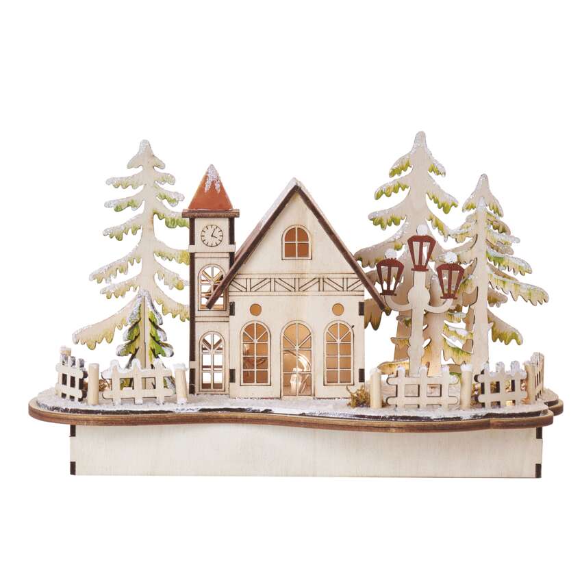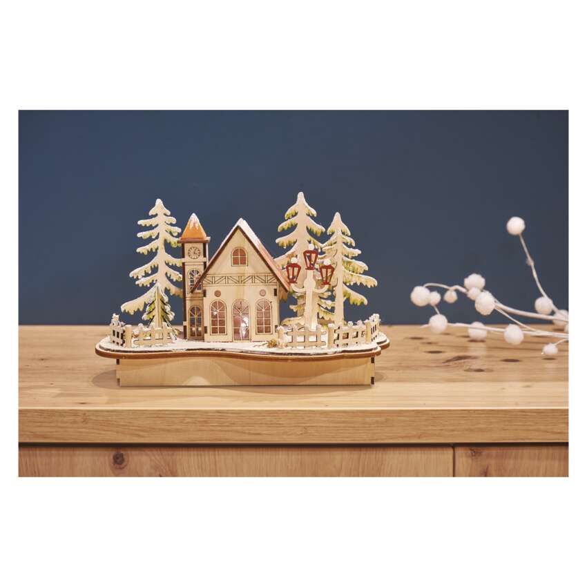 LED dekorace dřevěná – zasněžený kostel, 15 cm, 2x AAA, vnitřní, teplá bílá, časovač