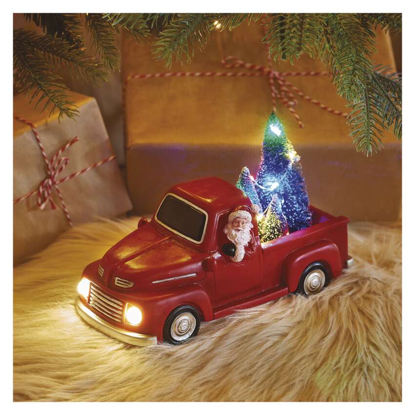 LED dekorace – Santa v autě s vánočními stromky, 10 cm, 3x AA, vnitřní, multicolor