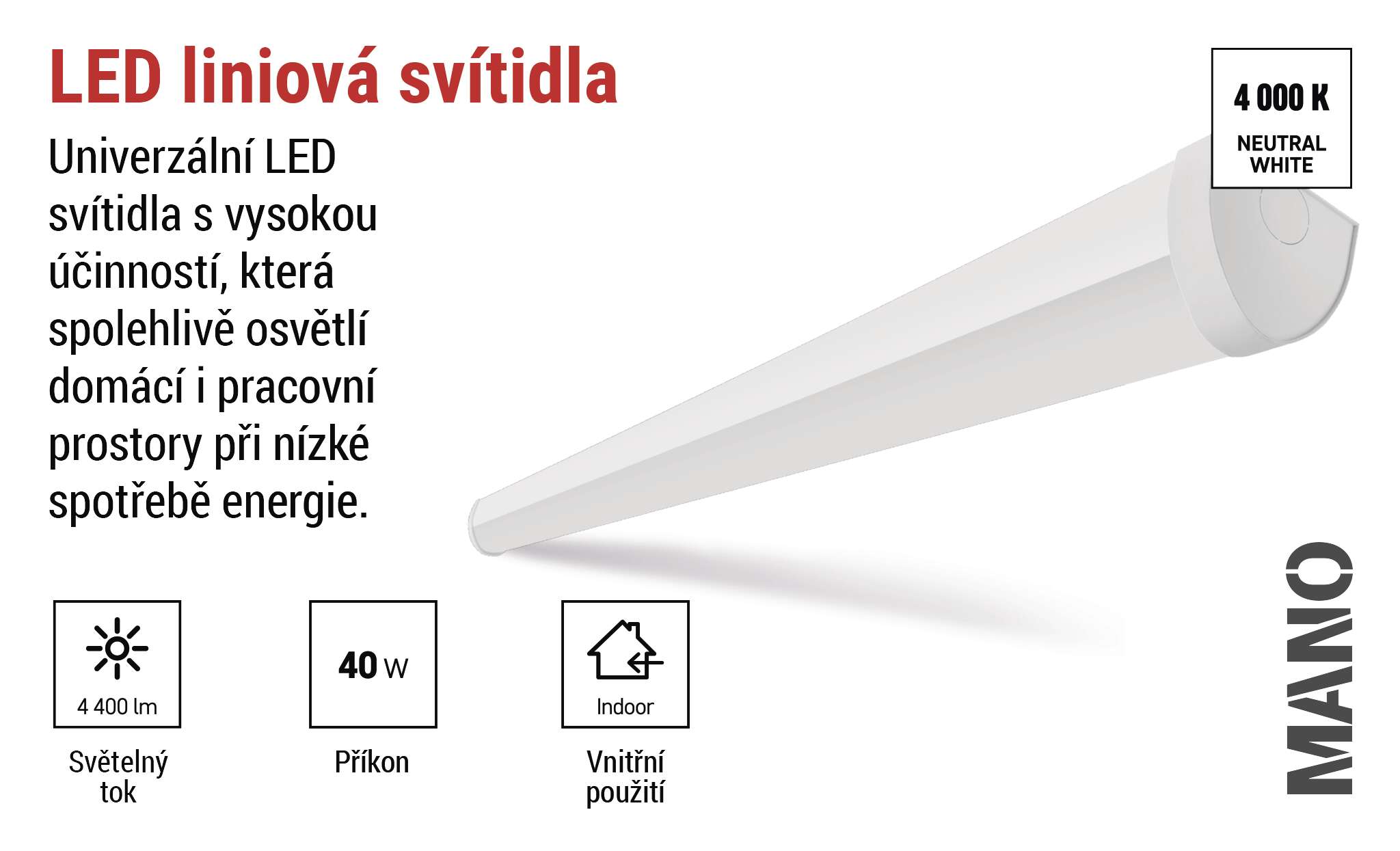 MANO nabízí příjemné a rovnoměrné osvětlení, které zlepšuje komfort každodenní práce i běžného provozu. Jeho jednoduchý a decentní design se hladce začlení do různých typů interiérů, a přitom poskytuje spolehlivou a dlouhodobou funkčnost. Díky kombinaci kvality, praktičnosti a moderního vzhledu je MANO svítidlo, na které se můžete spolehnout.