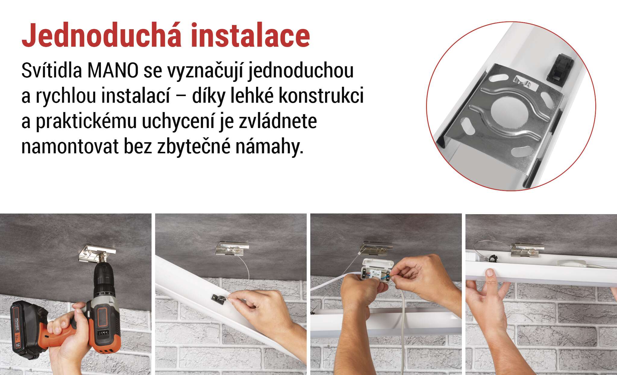 Díky promyšlené konstrukci je montáž svítidel MANO rychlá a bezproblémová. Svítidlo stačí jednoduše připevnit na strop nebo stěnu a okamžitě získáte spolehlivé osvětlení bez složitého zapojování či speciálního nářadí.