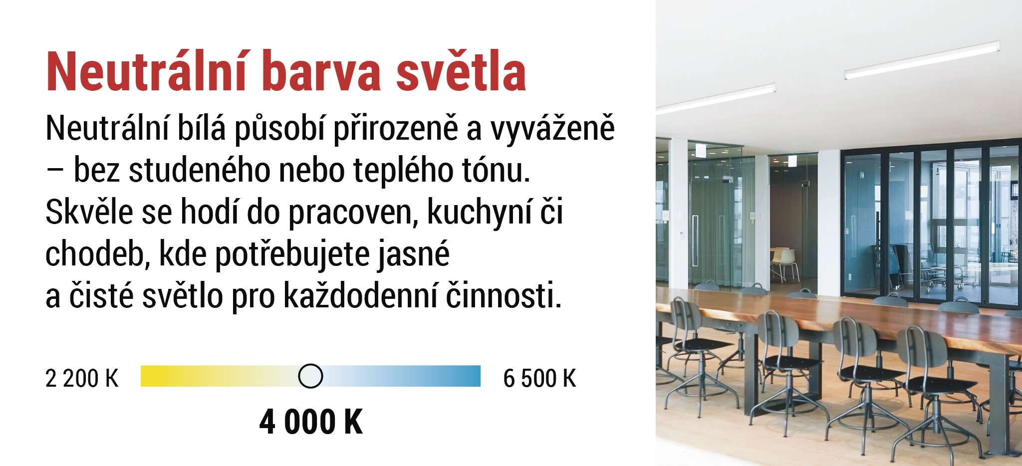 Svítidla MANO svítí příjemnou neutrální bílou barvou světla, která věrně podává barvy a nezkresluje okolí. Tento odstín je ideální pro pracovní i obytné prostory – působí přirozeně, neunavuje oči a vytváří příjemnou atmosféru po celý den. Díky rovnoměrnému rozložení světla zajišťuje jasné osvětlení bez stínů. Neutrální bílá se navíc skvěle hodí do moderních interiérů, kde podtrhuje čistý a elegantní vzhled prostoru.