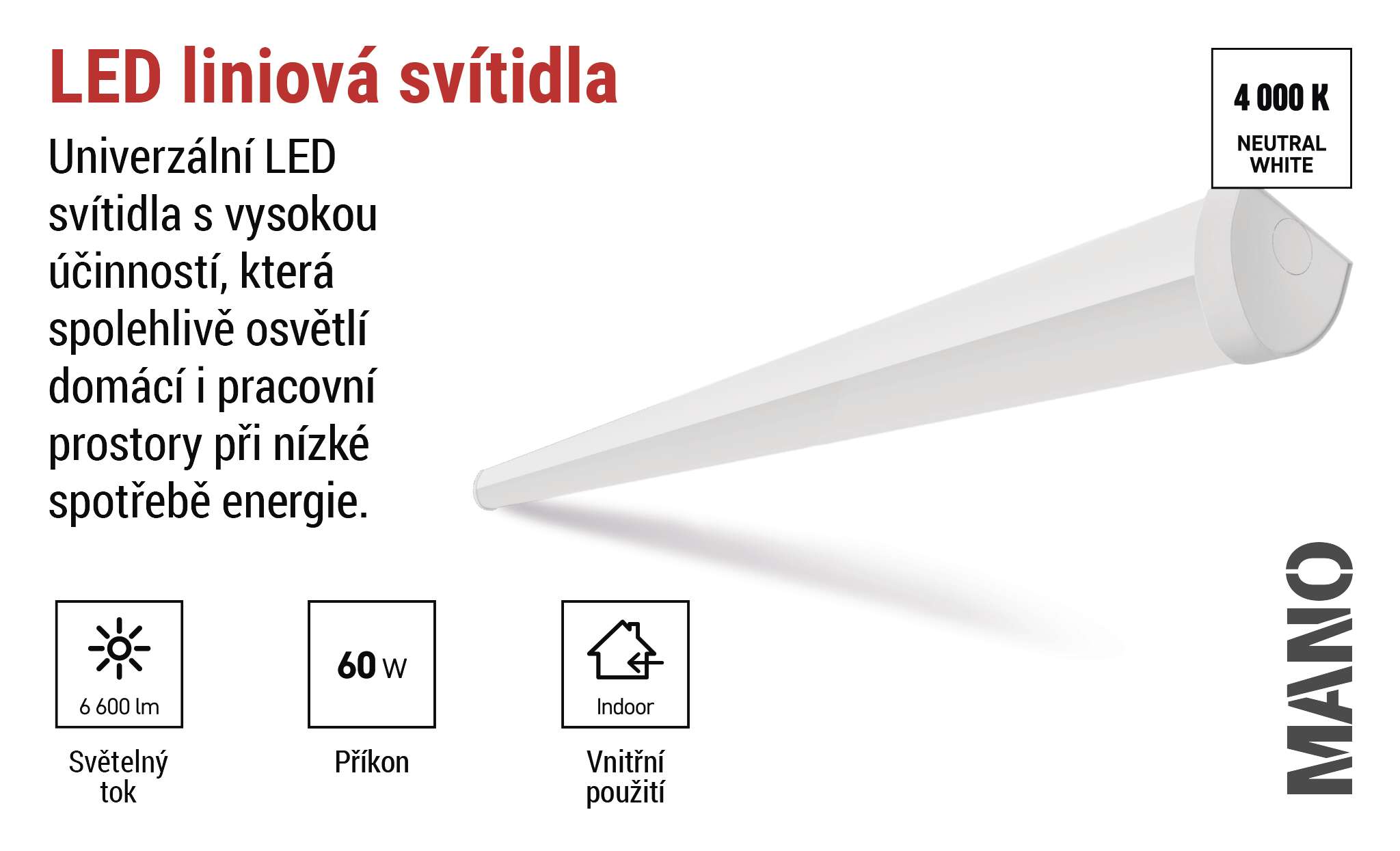 MANO nabízí příjemné a rovnoměrné osvětlení, které zlepšuje komfort každodenní práce i běžného provozu. Jeho jednoduchý a decentní design se hladce začlení do různých typů interiérů, a přitom poskytuje spolehlivou a dlouhodobou funkčnost. Díky kombinaci kvality, praktičnosti a moderního vzhledu je MANO svítidlo, na které se můžete spolehnout.