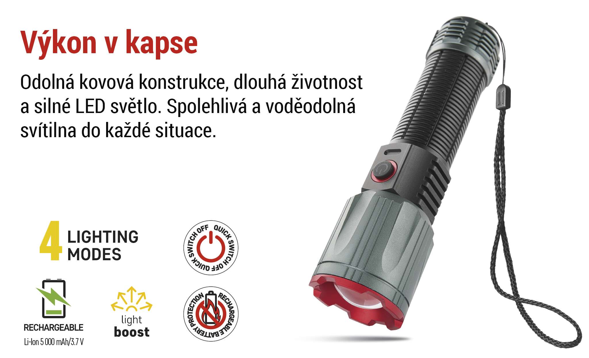 | doba svícení detail | LED BOOST – 1 min, LED 100 % – 3,5 h, LED 50 % – 7 h, LED 20 % – 15 h |