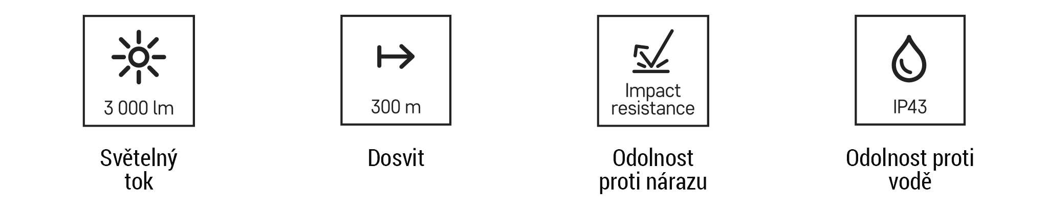 | dosvit | LED BOOST – 300 m, LED 100 % – 230 m, LED 50 % – 170 m, LED 20 % – 120 m |