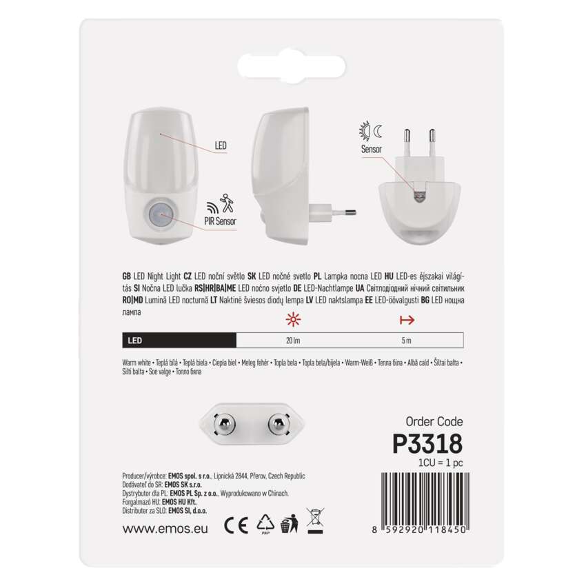 Tmy se již není třeba obávat díky nočnímu světlu EMOS P3318. Jednoduše ho připojíte do zásuvky a světelný senzor (day/night senzor) se sám automaticky postará o jeho aktivaci dle intenzity okolního světla. Model je vybaven PIR čidlem pohybu, který rozsvítí světlo jen když je potřeba. Malé rozměry a jednoduchý nadčasový design z něj pak dělají praktického pomocníka do každé domácnosti.