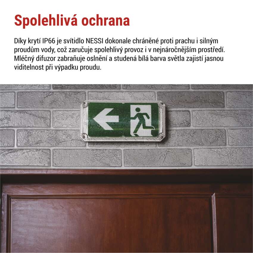 Nouzové svítidlo NESSI je klíčovým prvkem každé budovy. Zajistí, že i při výpadku elektřiny zůstane cesta k bezpečnému východu vždy dobře viditelná. Díky moderní konstrukci a kvalitnímu zpracování je NESSI navrženo tak, aby fungovalo bez kompromisů v každé situaci a poskytlo jistotu tam, kde je nejvíce potřeba.