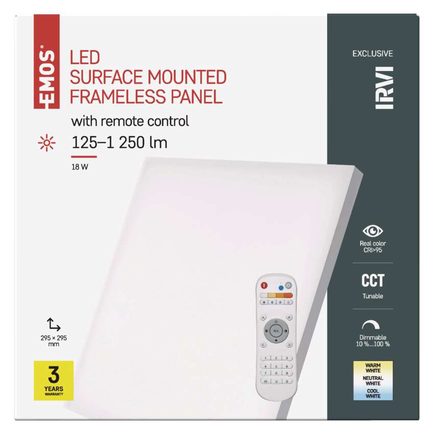 Pomocí ovladače lze svítidlo stmívat a měnit teplotu barev a to v rozsahu 2 700 až 6 500 K. Vysoký index podání barev CRI>95 zajišťuje věrné podání barev. Bezrámečkový design.