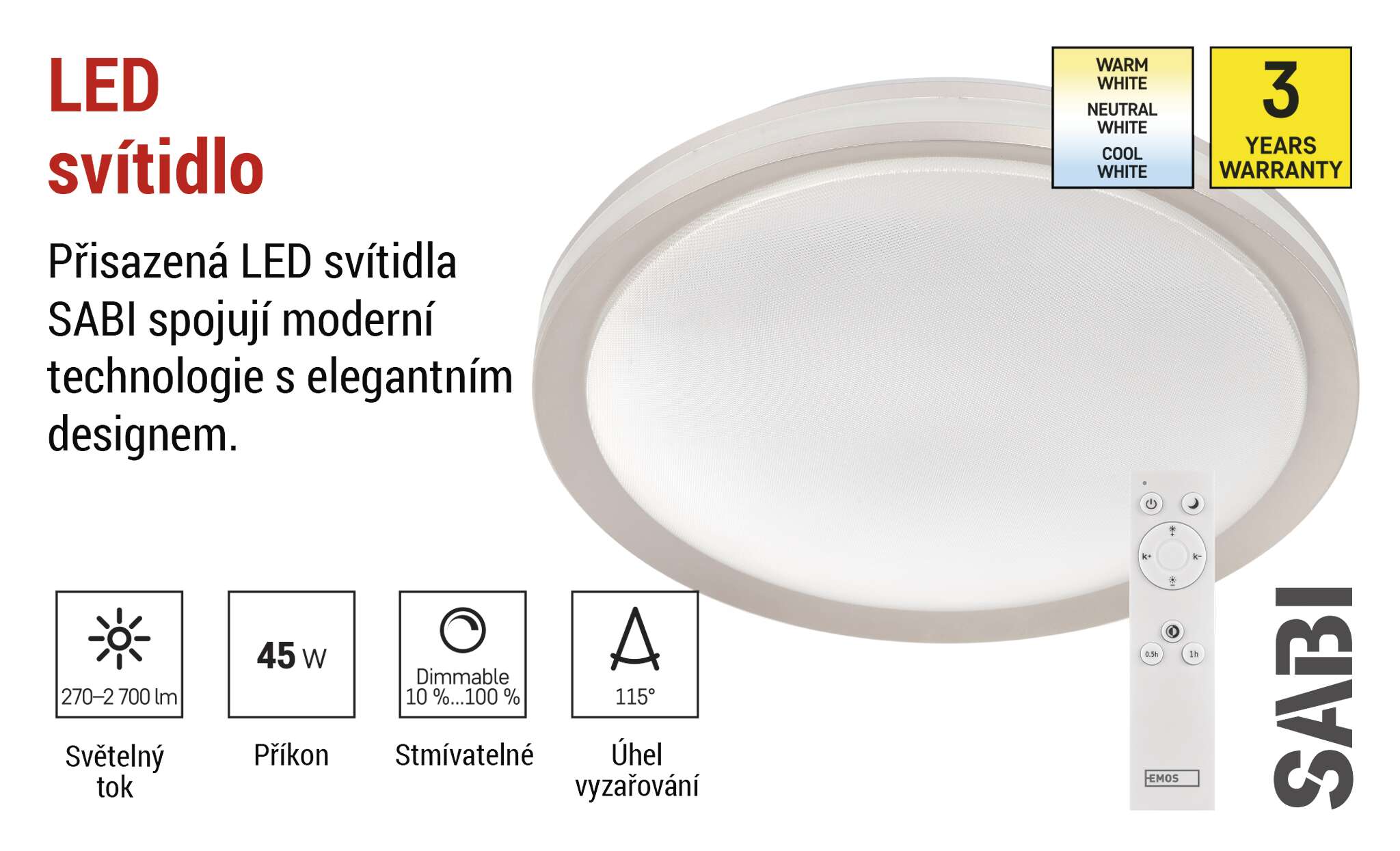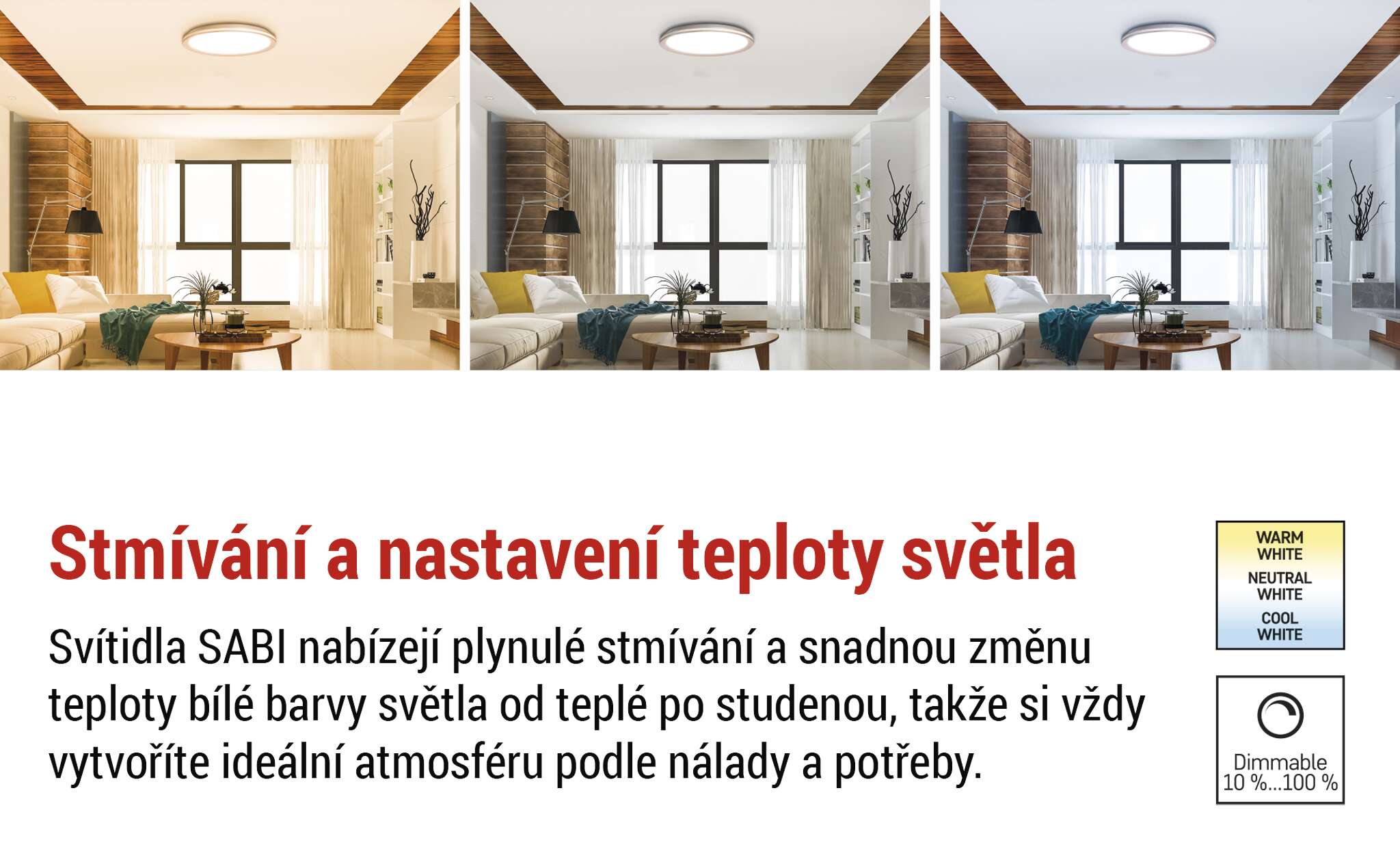 Spojení moderního designu a pokročilých funkcí, které zajišťují pohodlné a stylové osvětlení každého prostoru – to jsou LED svítidla SABI. Díky dálkovému ovládání snadno regulujete jas a měníte teplotu bílé barvy světla od teplé po studenou. Svítidla si pamatují poslední nastavení a umožňují ukládání oblíbené scény, takže vždy rychle získáte svou ideální atmosféru. Stylový starorůžový prsten spolu s difuzorem svítí rovnoměrně a dodává interiéru nadčasový vzhled, zatímco přisazená montáž zajišťuje jednoduchou a rychlou instalaci.