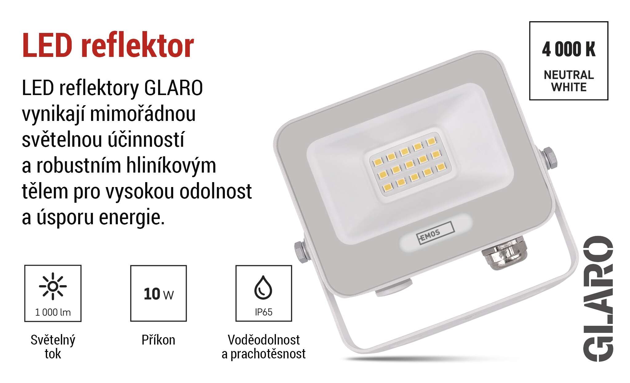 LED reflektor GLARO 10W, bílý, IP65, 1000 lm, neutrální bílá