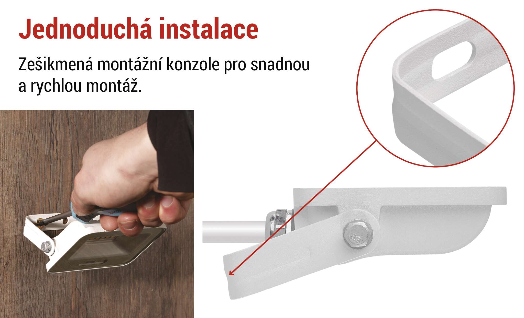 Reflektory GLARO jsou navrženy s praktickou zešikmenou montážní konzolí, která umožňuje rychlou a pohodlnou instalaci na stěnu, fasádu či jiný podklad. Díky možnosti nastavení úhlu osvětlení přesně podle potřeby můžete světlo směrovat tam, kde je nejvíce potřeba, aniž by bylo nutné složité vrtání či úpravy. Jednoduchá montáž šetří čas i námahu a dělá z GLARO ideální volbu pro domácí instalace.