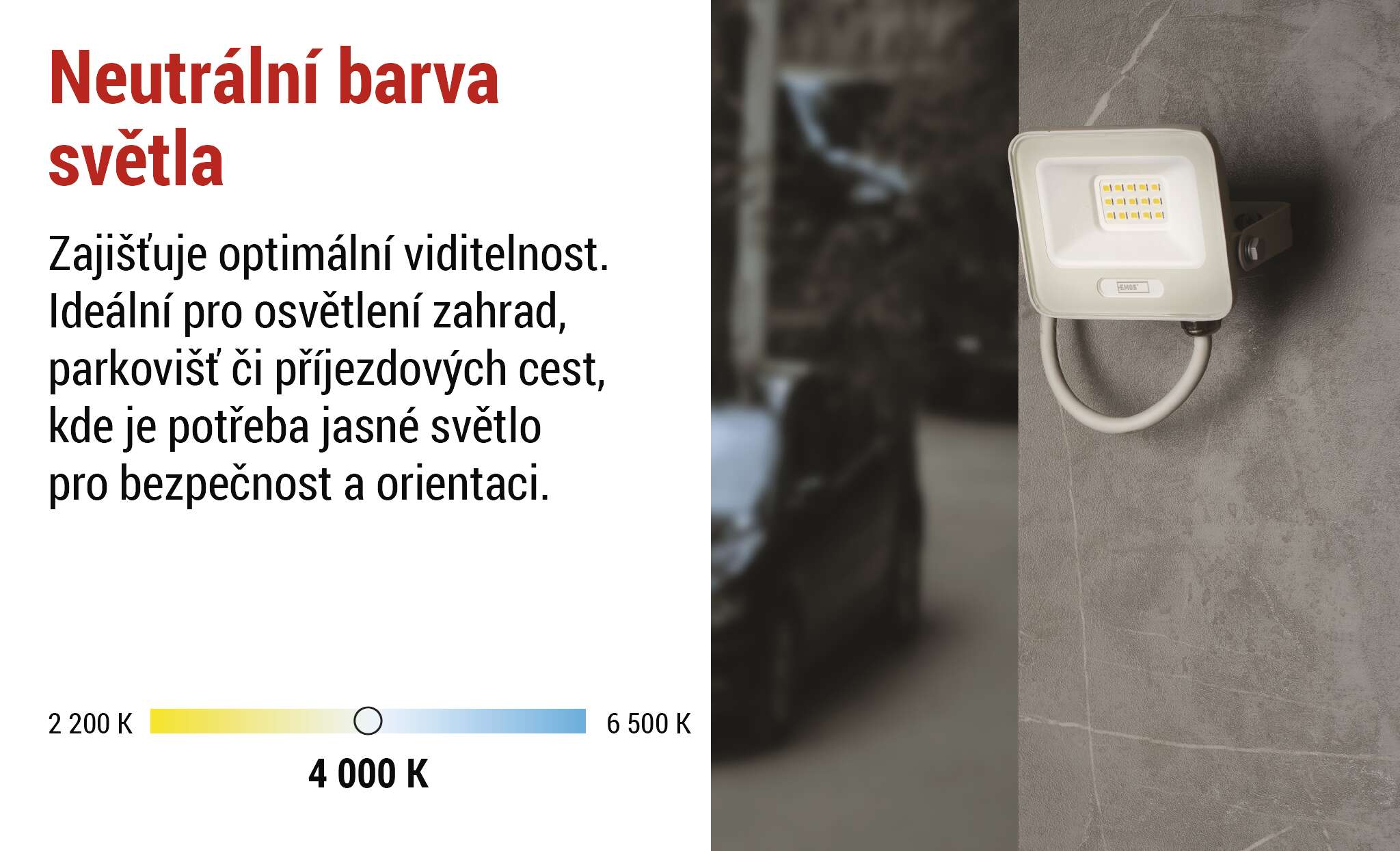 Reflektory GLARO svítí neutrální bílou barvou světla, která nabízí přirozené a komfortní osvětlení bez ostrých modrých tónů ani žlutého nádechu. Zajišťuje optimální viditelnost a věrné podání barev. Díky tomu se prostor osvětluje rovnoměrně, světlo je příjemné pro oči a vytváří bezpečné prostředí pro pohyb i práci.