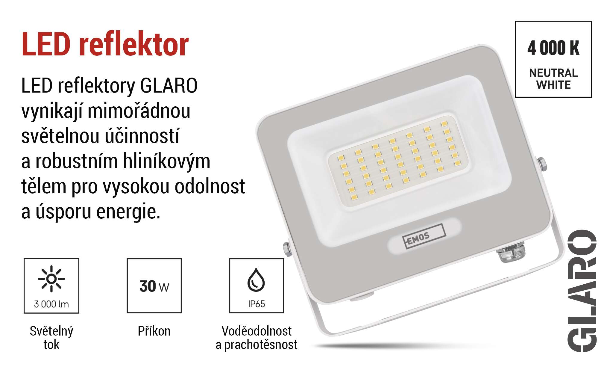 Řada LED reflektorů GLARO nabízí spolehlivý světelný výkon, vysokou účinnost a dlouhou životnost. Díky krytí IP65 jsou reflektory plně připraveny na venkovní použití a bez problému odolají dešti, prachu i nízkým teplotám. Odolné hliníkové tělo zajišťuje skvělou mechanickou odolnost a efektivní odvod tepla. Představují ideální volbu pro osvětlení domů, zahrad, garáží i firemních objektů. Spojují vysoký výkon s dostupnou cenou, takže je ocení každý uživatel.