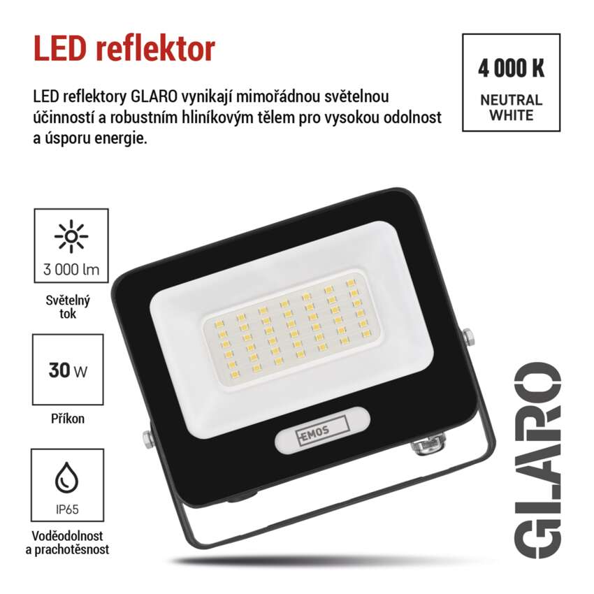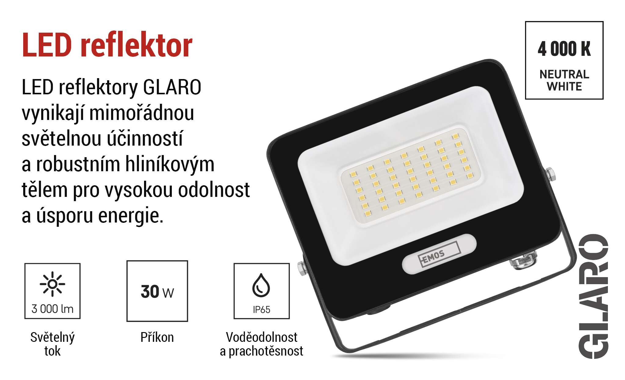 Řada LED reflektorů GLARO nabízí spolehlivý světelný výkon, vysokou účinnost a dlouhou životnost. Díky krytí IP65 jsou reflektory plně připraveny na venkovní použití a bez problému odolají dešti, prachu i nízkým teplotám. Odolné hliníkové tělo zajišťuje skvělou mechanickou odolnost a efektivní odvod tepla. Představují ideální volbu pro osvětlení domů, zahrad, garáží i firemních objektů. Spojují vysoký výkon s dostupnou cenou, takže je ocení každý uživatel.