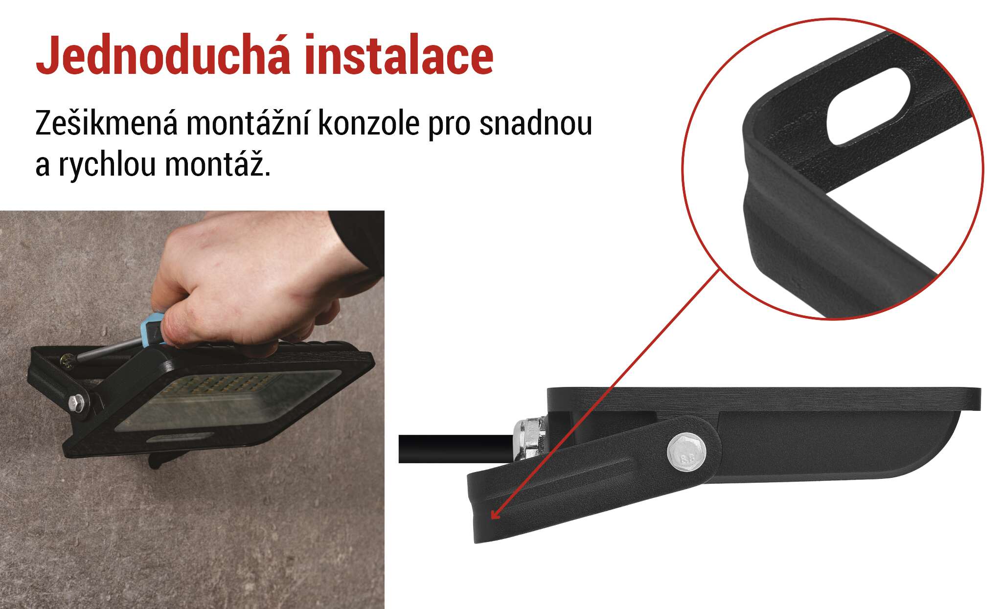Reflektory GLARO jsou navrženy s praktickou zešikmenou montážní konzolí, která umožňuje rychlou a pohodlnou instalaci na stěnu, fasádu či jiný podklad. Díky možnosti nastavení úhlu osvětlení přesně podle potřeby můžete světlo směrovat tam, kde je nejvíce potřeba, aniž by bylo nutné složité vrtání či úpravy. Jednoduchá montáž šetří čas i námahu a dělá z GLARO ideální volbu pro domácí instalace.