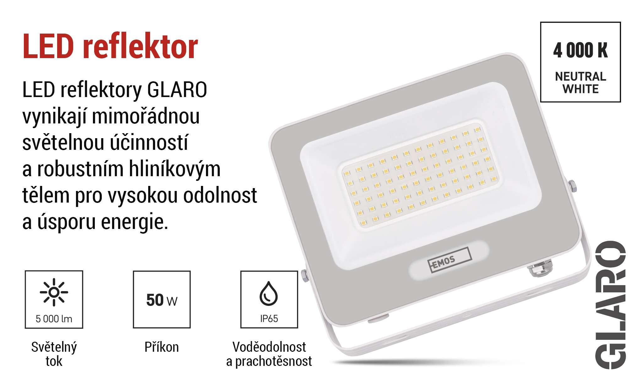Reflektory GLARO vynikají vysokou světelnou účinností 100 lm/W, což znamená, že při zachování silného světelného výkonu spotřebují méně energie než běžné LED reflektory. Díky tomu získáte jasné a efektivní osvětlení při nízkých provozních nákladech, ať už osvěcujete dům, garáž, zahradu nebo komerční objekt.