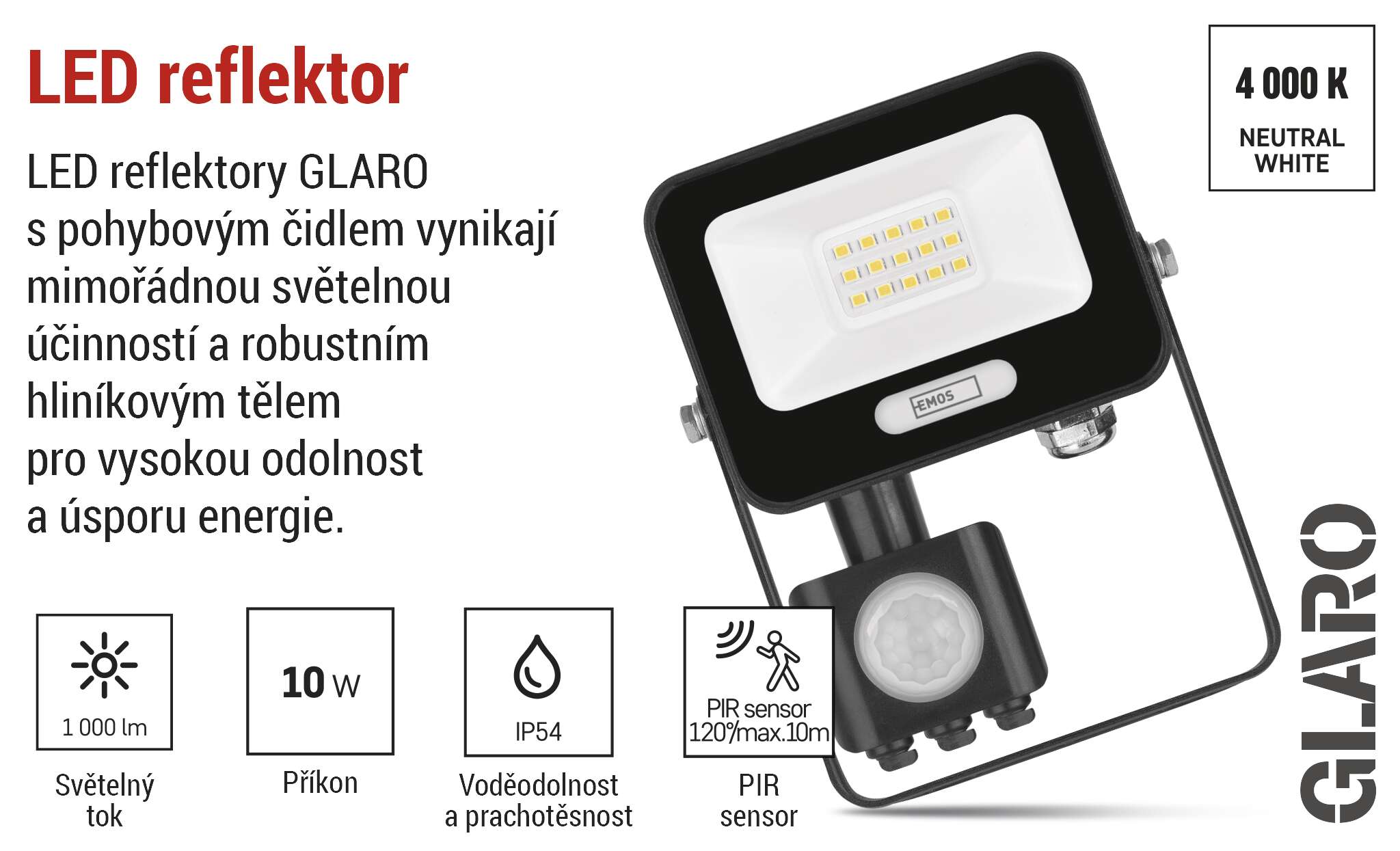LED reflektory GLARO s PIR senzorem přinášejí pohodlné a energeticky úsporné venkovní osvětlení. Díky automatickému spínání při detekci pohybu svítí jen tehdy, kdy je to skutečně potřeba – ideální pro zvýšení bezpečnosti a komfortu na vašem pozemku. Reflektory jsou vhodné pro montáž pod střechu nebo na stěnu objektu, chráněné krytím IP54. Představují praktické řešení pro osvětlení vstupů, garáží, zahradních chodníků, příjezdových cest i firemních prostor. Jednoduché nastavení citlivosti senzoru a délky svícení umožňuje přizpůsobení podle vašich potřeb.